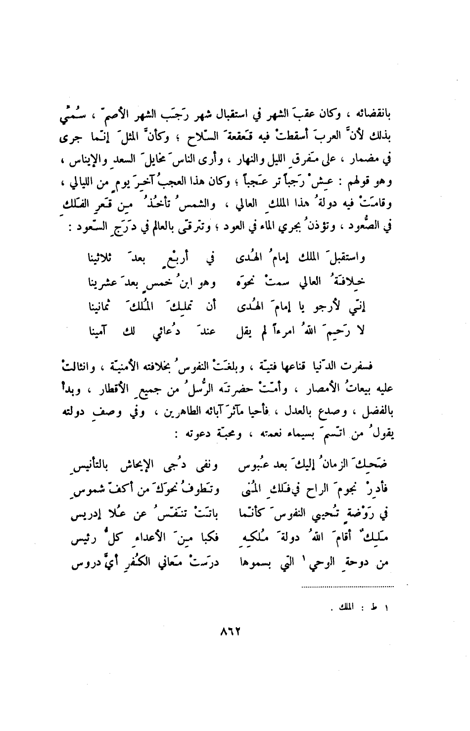 بانقضائه، وكان عقب الشهر في استقبال شهر رجب الشهر الأصم، سمي بذلك لأن العرب أسقطت فيه قعقعة السلاح؛ وكأن المثل إنما جرى في مضمار، على مفرق الليل والنهار، وأرى الناس مخايل السعد والإيناس، وهو قولهم: عش رجبا تر عجبا؛ وكان هذا العجب آخر يوم من الليالي، وقامت فيه دولة هذا الملك العالي، والشمس تأخذ من قعر الفلك في الصعود، وتؤذن بجري الماء في العود؛ وتترقى بالعالم في درج السعود: