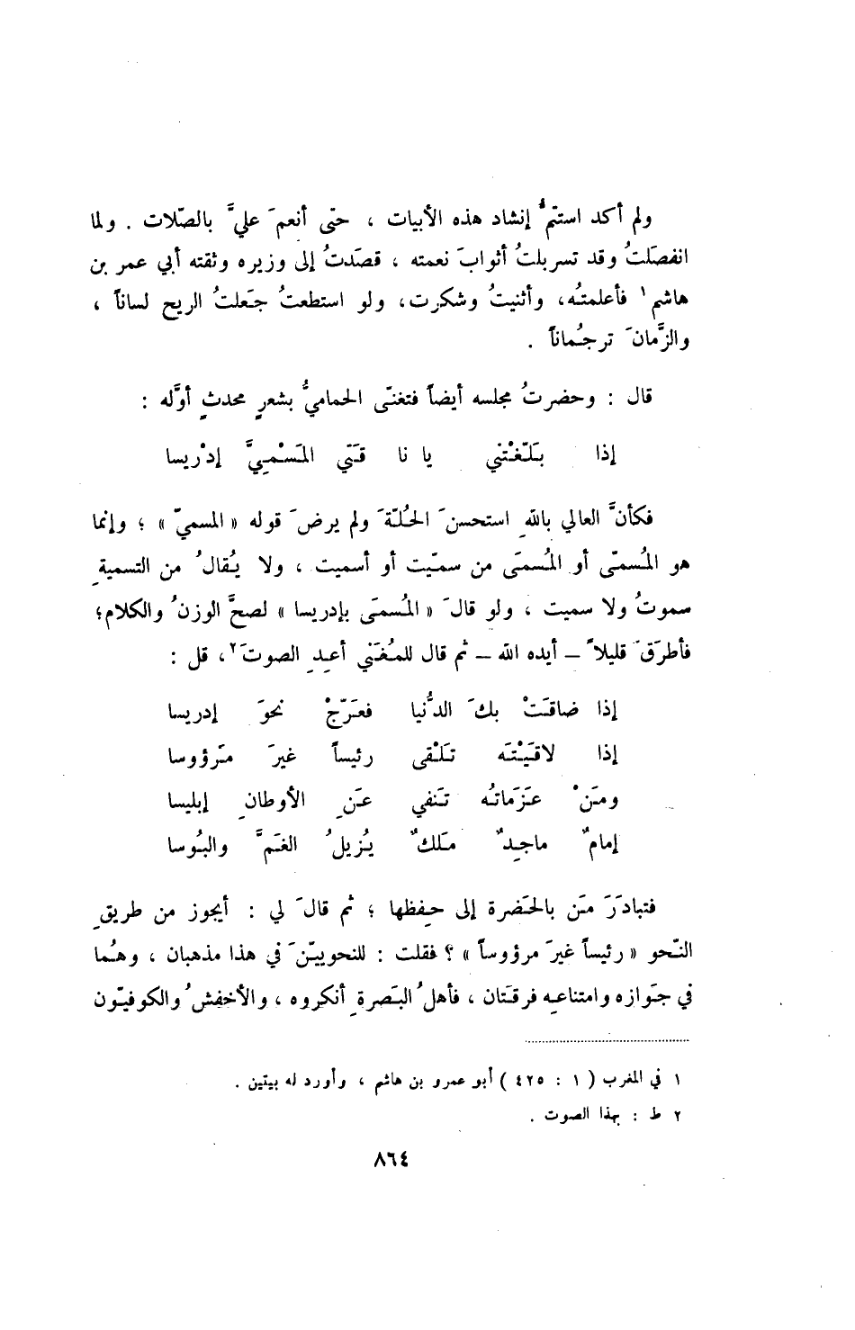 إذا بلغتني يا نا ... قتي المسمي إدريسا فكأن العالي بالله استحسن الحلة ولم يرض قوله " المسمي "؛ وإنما هو المسمى أو المسمى من سميت أو أسميت، ولا يقال من التسمية سموت ولا سميت، ولو قال " المسمى بإدريسا " لصالح الوزن والكلام؛ فأطرق قليلا - أيده الله - ثم قال للمغني أعد الصوت، قل: