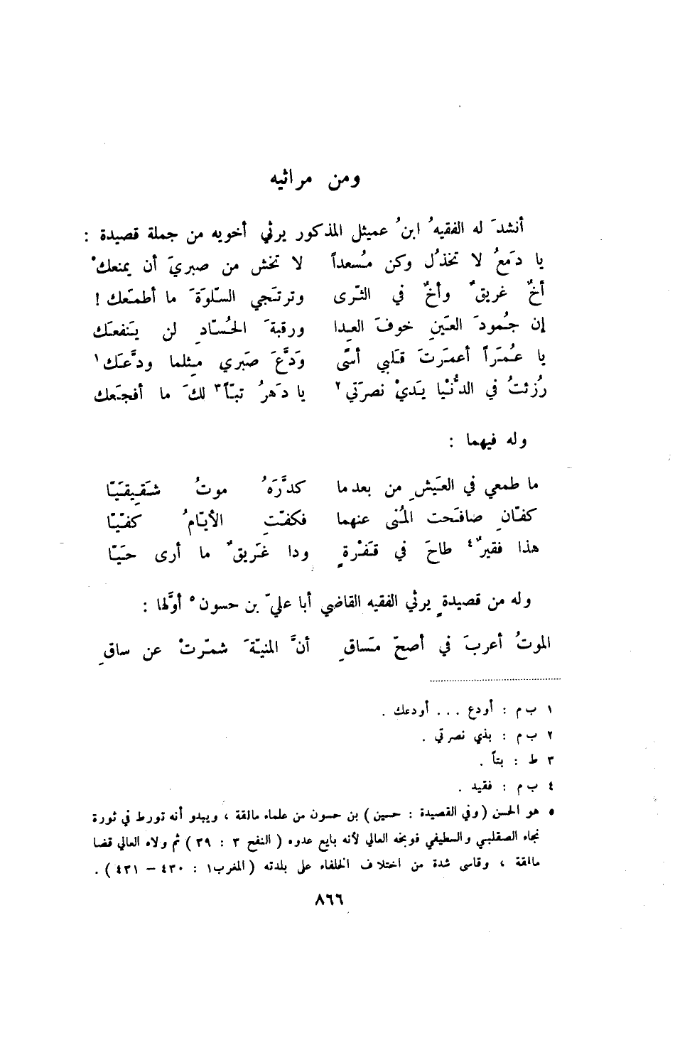 هذا فقير طاح في قفرة ... ودا غريق ما أرى حيا وله من قصيدة يرثي الفقيه القاضي أبا علي بن حسون أولها: