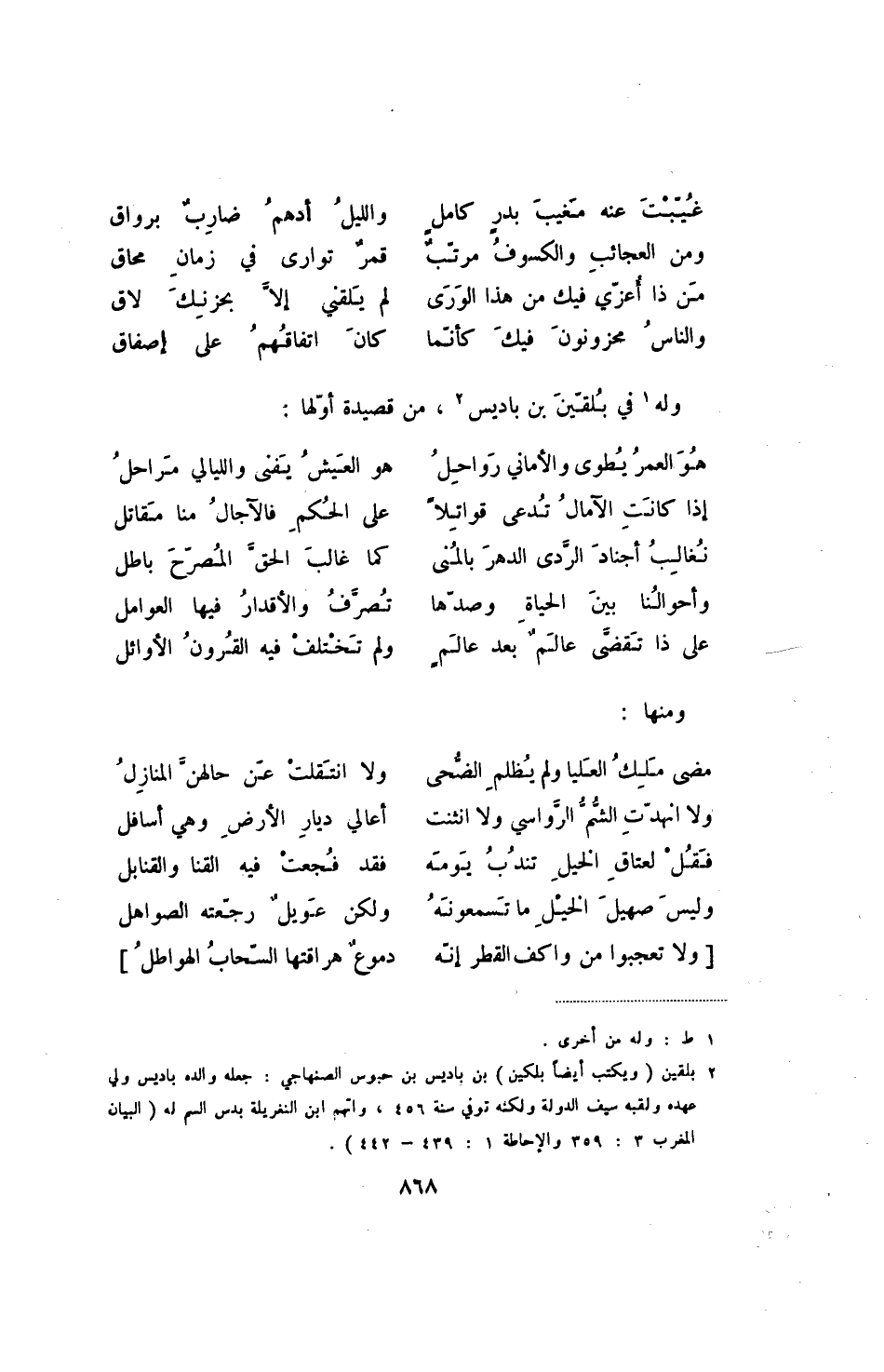 والناس محزونون فيك كأنما ... كان اتفاقهم على إصفاق وله في بلقين بن باديس، من قصيدة أولها: