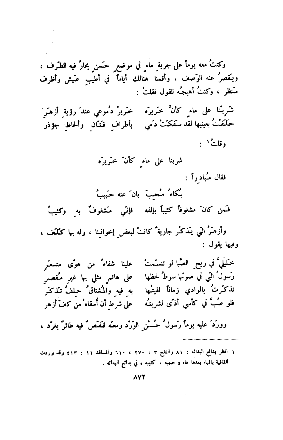وكنت معه يوماً على جرية ماءٍ في موضعٍ حسنٍ يحار فيه الطرف، ويقصر عنه الوصف، وأقمنا هنالك أياماً في أطيب عيش وأظرف منظر، وكنت أهيجه للقول فقلت: