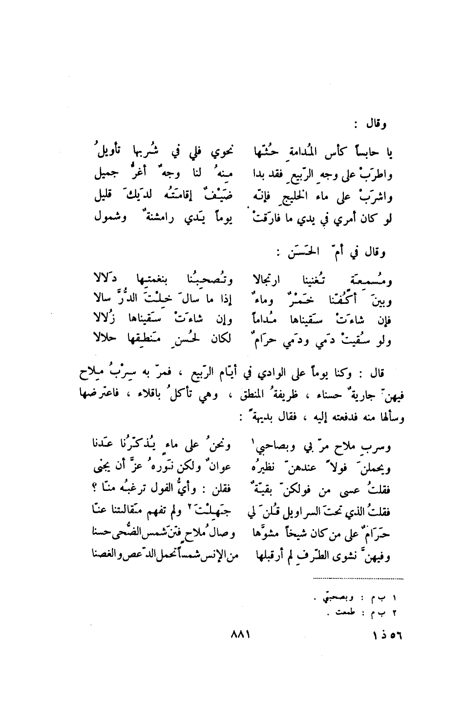 ولو سقيت دمي ودمي حرام ... لكان لحسن منطقها حلالا قال: وكنا يوماً على الوادي في أيام الربيع، فمر به سرب ملاح فيهن جارية حسناء، ظريفة المنطق، وهي تأكل باقلاء، فاعترضها وسألها منه فدفعته إليه، فقال بديهةً: