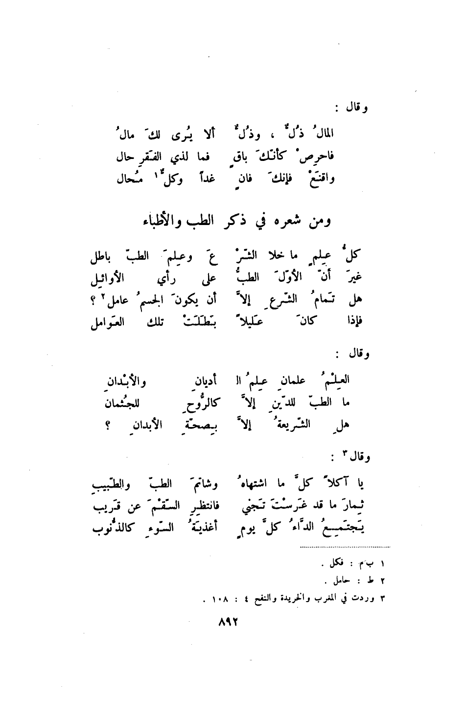 واقنع فإنك فانٍ ... غداً وكل محال @ومن شعره في ذكر الطب والأطباء