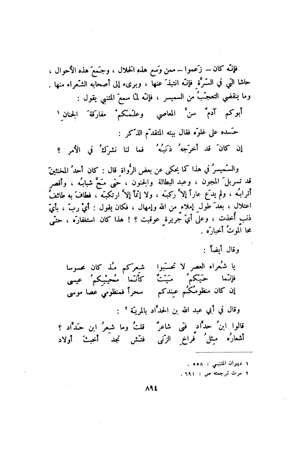 فإنه كان - زعموا - ممن وسع هذه الخلال، وجمع هذه الأحوال، حاشا التي في السرة فإنه انتبذ عنها، وبرئ إلى أصحابه الشعراء منها. وما ينقضي التعجب من السميسر، فإنه لما سمع المتنبي يقول: