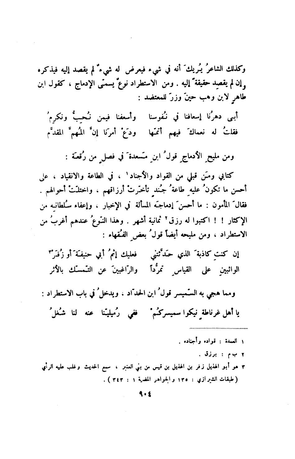 كتابي ومن قبلي من القواد والأجناد، في الطاعة والانقياد، على أحسن ما تكون عليه طاعة جند تأخرت أرزاقهم، واختلت أحوالهم. فقال المأمون: ما أحسن إدماجه المسألة في الأخبار، وإعفاء سلطانه من الإكثار! ! اكتبوا له رزق ثمانية أشهر. وهذا النوع عندهم أغرب من الاستطراد، ومن مليحه أيضاً قول بعض الفقهاء: