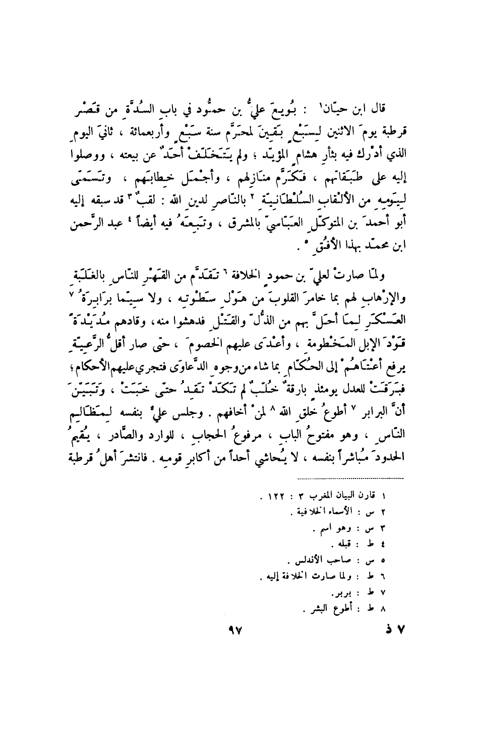 ولما صارت لعلي بن حمود الخلافة تقدم من القهر للناس بالغلبة والإرهاب لهم بما خامر القلوب من هول سطوته، ولا سيما برابرة العسكر لما أحل بهم من الذل والقتل فدهشوا منه، وقادهم مديدة قود الإبل المخطوطة، وأعدى عليهم الخصوم، حتى صار أقل الرعية يرفع أعتاهم إلى الحكام بما شاء من وجوه الدعاوى فتجري عليهم الأحكام؛ فبرقت للعدل يومئذ بارقة خلب لم تكد تقد حتى خبت، وتبين أن البرابر أطوع خلق الله لمن أخافهم. وجلس علي بنفسه لمظالم الناس، وهو مفتوح الباب، مرفوع الحجاب، للوارد والصادر، يقيم الحدود مباشراً بنفسه، لا يحاشي أحداً من أكابر قومه. فانتشر أهل قرطبة