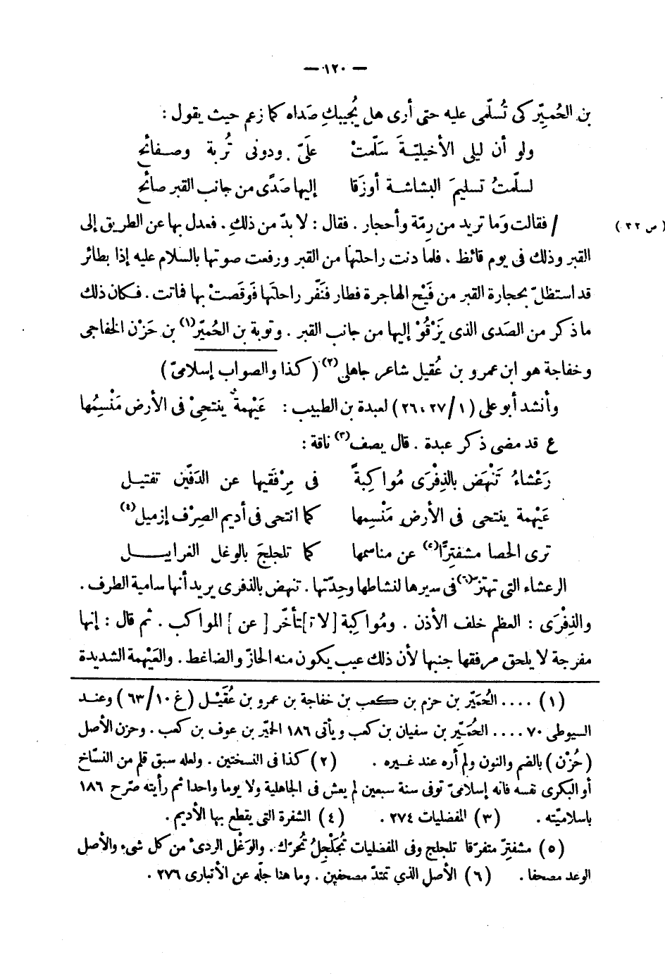 فقالت وما تريد من رمّة وأحجار. فقال: لابدّ من ذلك، فعدل بها عن الطريق إلى القبر وذلك في يوم قائظ، فلما دنت راحلتها من القبر ورفعت صوتها بالسلام عليه إذا بطائر قد استظلّ بحجارة القبر من فيح الهاجرة فطار فنفّر راحلتها فوقصت بها فماتت. فكان ذلك ما ذكر من الصدى الذي يزقو إليها من جانب القبر. وتوبة بن الحميّر بن حزن الخفاجي وخفاجة هو ابن عمرو بن عقيل شاعر جاهلي " كذا والصواب إسلاميّ " وأنشد أبو علي " 1 - 27، 26 " لعبدة بن الطبيب: