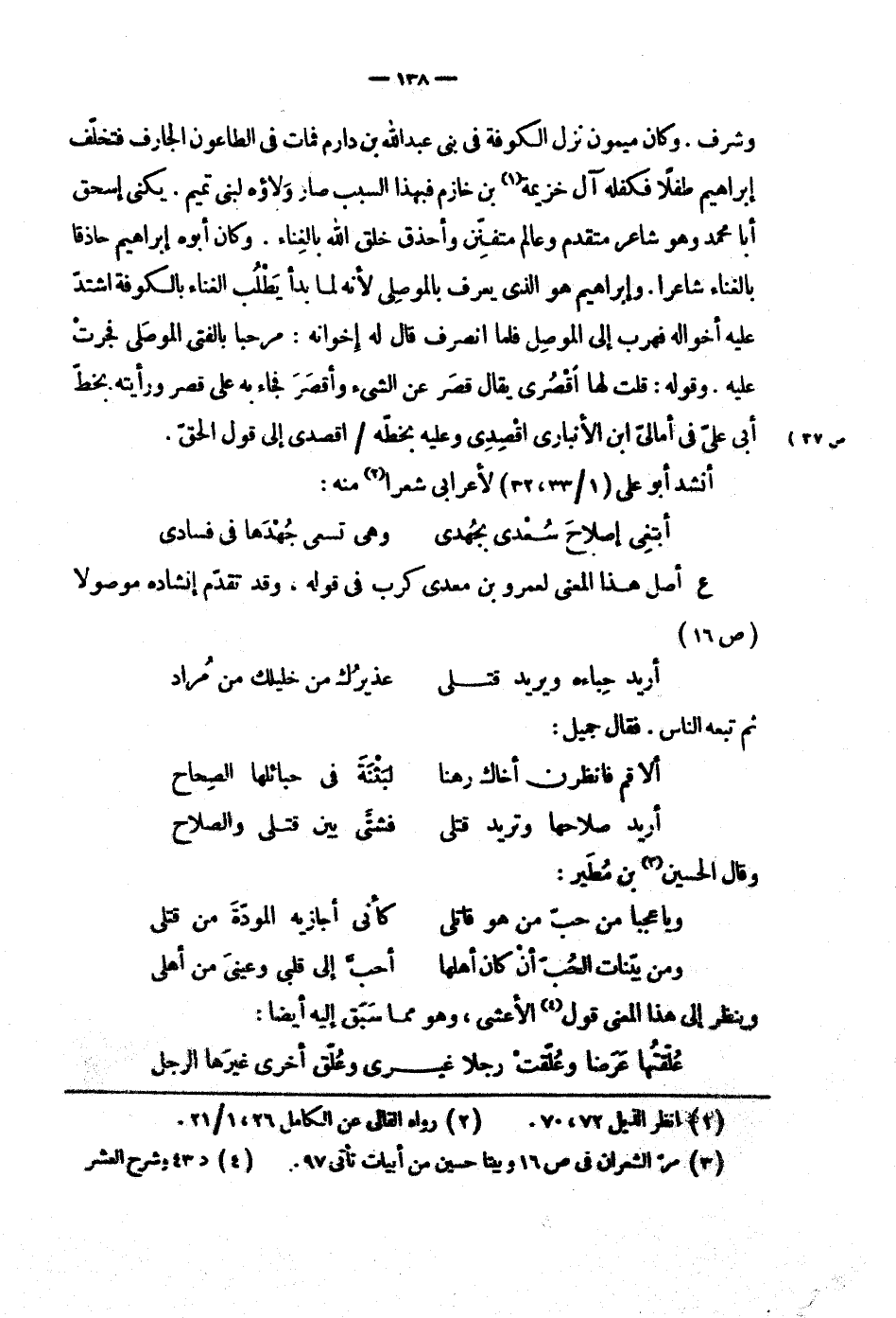 وشرف. وكان ميمون نزل الكوفة في بني عبد الله بن دارم فمات في الطاعون الجارف فتخلّف إبراهيم طفلاً فكفله آل خزيمة بن خازم فبهذا السبب صار ولاؤه لبني تميم. يكنى إسحاق أبا محمد وهو شاعر متقدم وعالم متفنّن وأحذق خلق الله بالغناء. وكان أبوه إبراهيم حاذقاً بالغناء شاعراً. وإبراهيم هو الذي يعرف بالموصلي لأنه لما بدأ يطلب الغناء بالكوفة اشتدّ عليه أخواله فهرب إلى الموصل فلما انصرف قال له إخوانه: مرحباً بالفتى الموصلي فجرت عليه. وقوله: قلت لها اقصري يقال قصر عن الشيء وأقصر فجاء به على قصر ورأيته بخطّ أبي عليّ في أماليّ ابن الأنباري اقصدي وعليه بخطّه اقصدي إلى قول الحقّ.