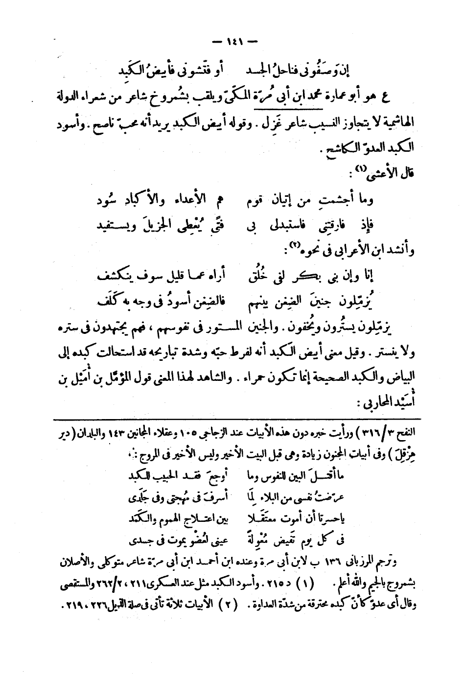 ع هو أبو عمارة محمد بن أبي مرّة المكّيّ ويلقب بشمروخ شاعر من شعراء الدولة الهاشمية لا يتجاوز النسيب شاعر غزل. وقوله أبيض الكبد يريد أنه محبّ ناصح. وأسود الكبد العدوّ الكاشح.