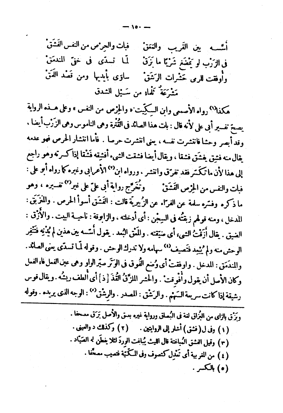 هكذا رواه الأصمعي وابن السكّيت " والحرص من النفس " وعلى هذه الرواية يصحّ تفسير أبي علي لأنه قال: بات هذا الصائد في القترة وهي الناموس وهي الزرب أيضاً، وقد أبصر وحشاً فانتشرت نفسه، يعني انتشرت حرصاً. فأما انتشار الحرص فهو عدمه يقال منه فشق يفشق فشقاً، ويقال أيضاً فشقت الشيء أفشقه فشقاً إذا كسرته وهو راجع إلى هذا لأن ما تكسّر فقد تفرّق وانتشر، ورواه ابن الأعرابي وغيره كما رواه أبو علي: