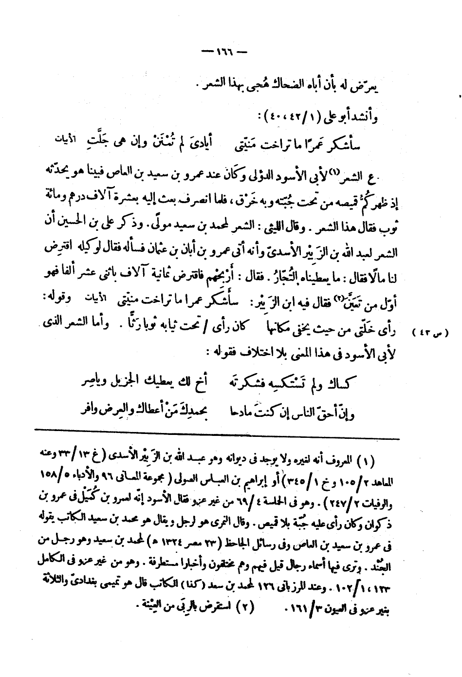 ع الشعر لأبي الأسود الدؤلي وكان عند عمرو بن سعيد بن العاص فبينا هو يحدّثه إذ ظهركمّ قميصه من تحت جبّته وبه خرق، فلما انصرف بعث إليه بعشرة آلاف درهم ومائة ثوب فقال هذا الشعر. وقال الليثي: الشعر لمحمد بن سعيد مولى. وذكر علي بن الحسين أن الشعر لعبد الله بن الزبير الأسديّ وأنه أتى عمرو بن أبان بن عثمان فسأله فقال لوكيله اقترض لنا مالاً فقال: ما يعطيناه التجّار. فقال: أربحهم فاقترض ثمانية آلاف باثني عشر ألفاً فهو أوّل من تعيّن فقال فيه ابن الزبير: