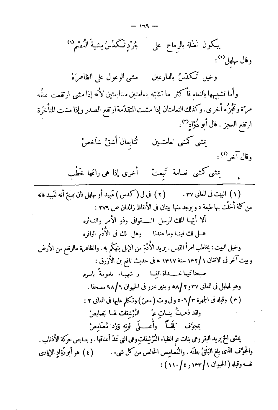 وأما تشبيهها بالنعام فأكثر ما تشبّه بنعامتين متتابعتين لأنه إذا مشى ارتفعت عنقه مرّة وعجزه أخرى. وكذلك النعامتان إذا مشت المتقدّمة ارتفع الصدر وإذا مشت المتأخرّة ارتفع العجز. قال أبو دؤاد: