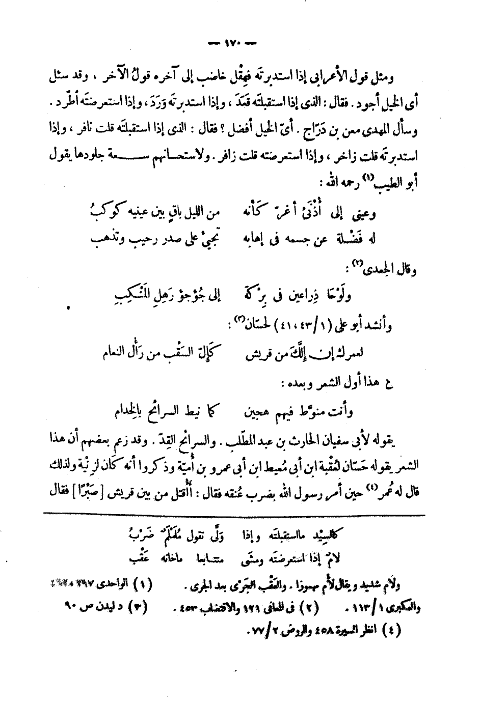 ومثل قول الأعرابي إذا استدبرته فهقل خاضب إلى آخره قول الآخر، وقد سئل أي الخيل أجود. فقال: الذي إذا استقبلته قعد، وإذا استدبرته ورد، وإذا استعرضته اطّرد. وسأل المهدي معن بن درّاج. أيّ الخيل أفضل؟ فقال: الذي إذا استقبلته قلت نافر، وإذا استدبرته قلت زاخر، وإذا استعرضته قلت زافر. ولاستحسانهم سعة جلودها يقول أبو الطيب رحمه الله: