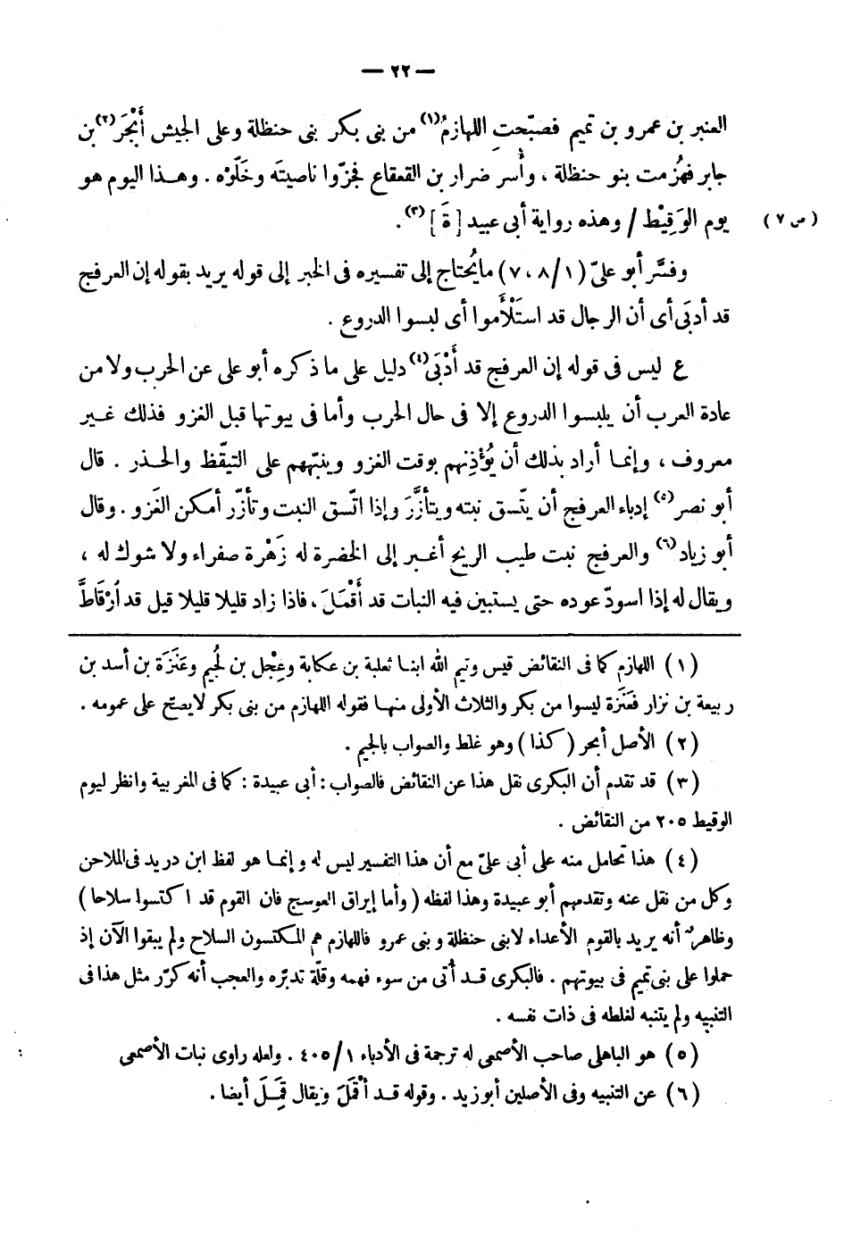 ع ليس في قوله إن العرفج قد أدبى دليل على ما ذكره أبو علي عن الحرب ولا من عادة العرب أن يلبسوا الدروع إلا في حال الحرب وأما في بيوتها قبل الغزو فذلك غير معروف، وإنما أراد بذلك أن يؤذنهم بوقت الغزو وينبّههم على التيقّظ والحذر. قال أبو نصر إدباء العرفج أن يتّسق نبته ويتأزّر وإذا اتّسق النبت وتأزّر أمكن الغزو. وقال أبو زياد والعرفج نبت طيب الريح أغبر إلى الخضرة له زهرة صفراء ولا شوك له، ويقال له إذا اسودّ عوده حتى يستبين فيه النبات قد أقمل، فإذا زاد قليلاً قليلاً قيل قد ارقاطّ