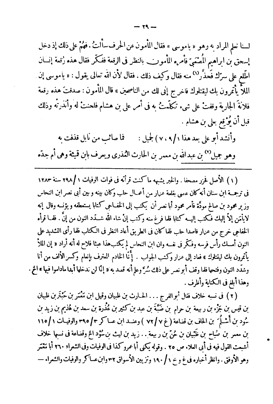 لسنا نعلم المراد به وهو " يا موسى " فقال المأمون عن الحرف سألت. فهم على ذلك إذ دخل إسحاق بن إبراهيم المصعبيّ فأمره المأمون بالنظر في الرقعة ففكّر فقال هذه رقعة إنسان اطّلع على سرّك فحذّر منه فقال وكيف ذلك. فقال لأن الله تعالى يقول: " يا موسى إن الملأ يأتمرون بك ليقتلوك فاخرج إني لك من الناصحين " قال المأمون: صدقت هذه رقعة فلانة الجارية وقفت على شيء تكلّمت به في أمر علي بن هشام فلحنت له وأنذرته وذلك قبل أن يوقع بعلي بن هشام.