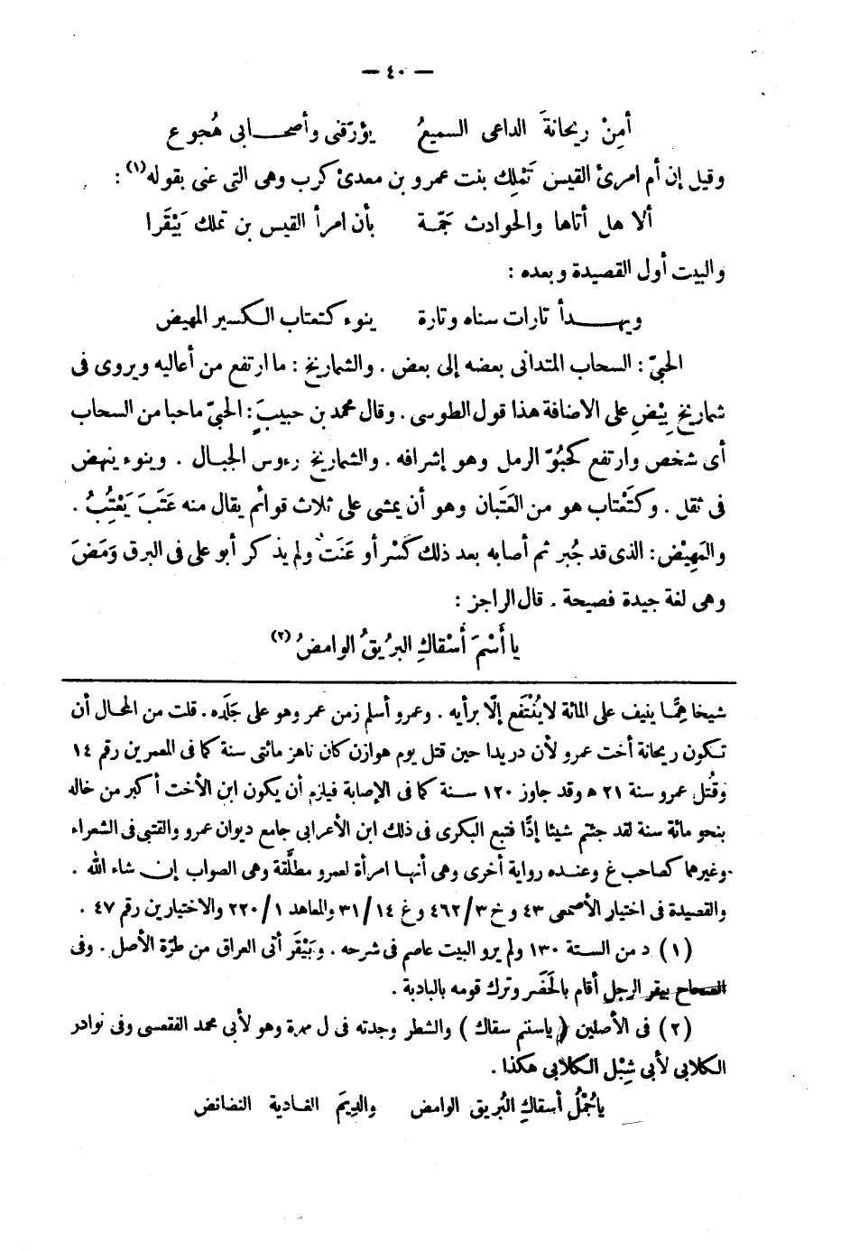 الحبيّ: السحاب المتداني بعضه إلى بعض. والشماريخ: ما ارتفع من أعاليه ويروى في شماريخ بيض على الإضافة هذا قول الطوسي. وقال محمد بن حبيب: الحبيّ ما حبا من السحاب أي شخص وارتفع كحبوّ الرمل وهو إشرافه. والشماريخ رءوس الجبال. وينوء ينهض في ثقل. وكتعتاب هو من العتبان وهو أن يمشي على ثلاث قوائم يقال منه عتب يعتب. والمهيض: الذي قد جبر ثم أصابه بعد ذلك كسر أو عنت ولم يذكر أبو علي في البرق ومض وهي لغة جيدة فصيحة. قال الراجز: