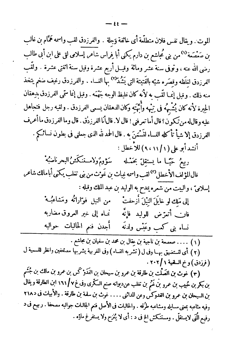 الموت. ويقال نفس فلان متطلّعة أي خائفة وجلة. والفرزدق لقب واسمه همّام بن غالب بن صعصعة من بني مجاشع بن دارم يكنى أبا فراس شاعر إسلامي لقي علي ابن أبي طالب رضي الله عنه، وتوفي سنة عشرة ومائة وقيل أربع عشرة وقيل سنة اثنتي عشرة. ولّقب الفرزدق لغلظه وقصره شبّه بالفتيتة التي يشدّ بها النساء، والفرزدق رغيف ضخم يتخذ منه ذلك. وقيل إنما لّقب به لأنه كان غليظ الوجه جهمه. وقيل إنما سمّي الفرزدق بدهقان الحيرة لأنه كان يشبه في تيهه وأبّهته وكان الدهقان يسمى الفرزدق. ولقيه رجل فتجاهل عليه وقال له من تكون؟ قال أما تعرفني! قال لا. قال أنا الفرزدق ما أعرف الفرزدق إلا شيئاً تأكله النساء لتسمن به. قال الحمد لله الذي جعلني في بطون نسائكم.