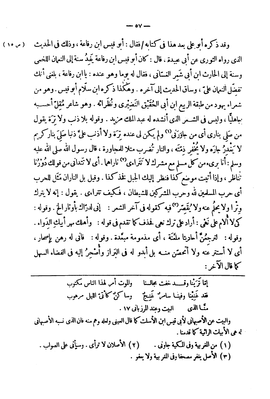 وقد ذكره أبو علي بعد هذا في كتابه فقال: أبو قيس ابن رفاعة، وذلك في الحديث الذي رواه الثوري عن أبي عبيدة، قال: كان أبو قيس ابن رفاعة يفد سنة إلى النعمان اللخمي وسنة إلى الحارث ابن أبي شمر الغسّاني، فقال له يوماً وهو عنده: يا ابن رفاعة، بلغني أنك تفضّل النعمان عليّ، وساق الحديث إلى آخره. وهكذا ذكره ابن سلاّم أبو قيس. وهو من شعراء يهود من طبقة الربيع ابن أبي الحقيق النضيري ونظرائه. وهو شاعر مقلّ أحسبه جاهليّاً، وليس في الشعر الذي أنشده له عبد الملك مزيد. وقوله بلا ذنب ولا ترة يقول من صلى بناري أي من جاورني ولم يكن لي عنده ترة ولا أذنب عليّ ذنباً صلى بنار كريم لا يغدر جاره ولا يخفر ذمتّه، والنار تضرب مثلاً للمجاورة، قال رسول الله صلى الله عليه وسلم: أنا برئ من كل مسلم مع مشرك لا تتراءى ناراهما. أي لا تتدانى من قولك دورنا تناظر، وإذا أتيت موضع كذا فنظر إليك الجبل فخذ كذا. وقيل بل الناران مثل للحرب أي حرب المسلمين لله وحرب المشركين للشيطان، فكيف تتراءى. يقول: إنه لا يترك وتراً ولا يحلم عنه ولا يقصّر فيه كقوله في آخر الشعر: إني لدرّاك بأوتار الخ. وقوله: كي لا ألام على نهى: أراد على ترك نهى فحذف كما تقدم في قوله: وأهلك مهر أبيك الدواء. وقوله: لترجعنّ أحاديثا ملعّنة، أي مذمومة مبعّدة. وقوله: فإني له رهن بإصحار، أي لا أستتر عنه ولا أتحصّن منه بل أبدو له في البراز وأصحر إليه في الفضاء السهل كما قال الآخر: