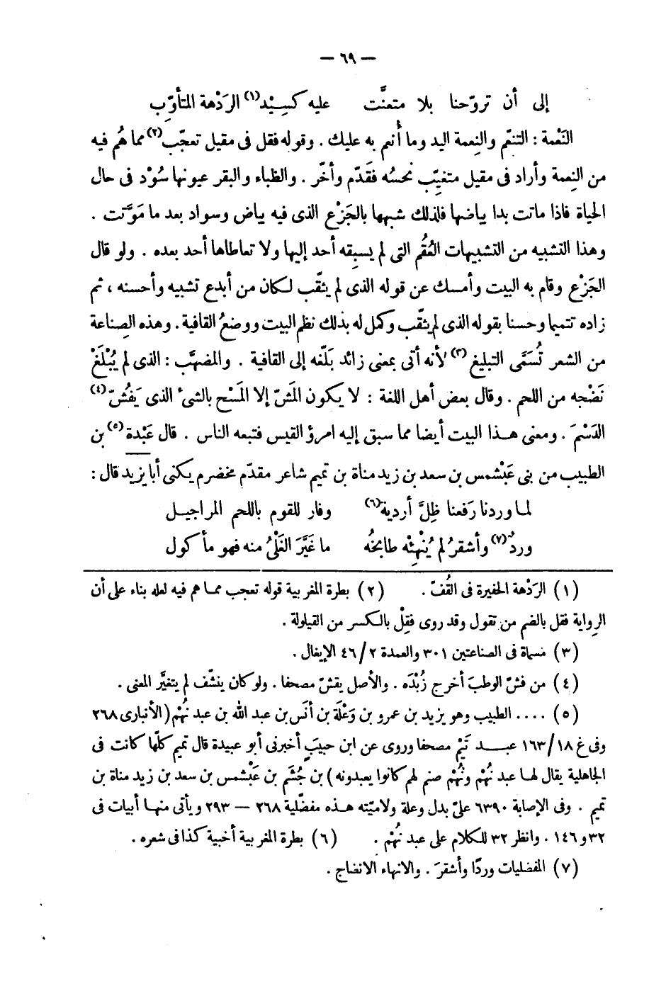 النعمة: التنّعم والنعمة اليد وما أنعم به عليك. وقوله فقل في مقيل تعجّب مما هم فيه من النعمة وأراد في مقيل متغيّب نحسه فقدّم وأخّر. والظباء والبقر عيونها سود في حال الحياة فإذا ماتت بدا بياضها فلذلك شبهها بالجزع الذي في بياض وسواد بعد ما موّتت. وهذا التشبيه من التشبيهات العقم التي لم يسبقه أحد إليها ولا تعاطاها أحد بعده. ولو قال الجزع وقام به البيت وأمسك عن قوله الذي لم يثقّب لكان من أبدع تشبيه وأحسنه، ثم زاده تتميماً وحسناً بقوله الذي لم يثقّب وكمل له بذلك نظم البيت ووضع القافية. وهذه الصناعة من الشعر تسمّى التبليغ لأنه أتى بمعنى زائد بلّغه إلى القافية. والمضهّب: الذي لم يبلغ نضجه من اللحم. وقال بعض أهل اللغة: لا يكون المشّ إلا المسح بالشيء الذي يفشّ الدسم. ومعنى هذا البيت أيضاً مما سبق إليه امرؤ القيس فتبعه الناس. قال عبدة بن الطبيب من بني عبشمس بن سعد بن زيد مناة بن تميم شاعر مقدّم مخضرم يكنى أبا يزيد قال:
