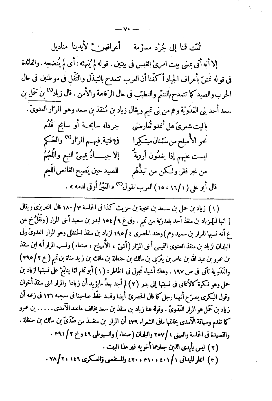 إلا أنه أتى بمعنى بيت امرئ القيس في بيتين. قوله لم ينهئه: أي لم ينضجه. والفائدة في قوله نمشّ بأعراف الجياد أكفّنا أن العرب تتمدح بالتبذّل والتفل في موطنين في حال الحرب والصيد كما تتمدح بالتنعّم والتطيّب في حال الرفاهة والأمن. قال زياد بن حمل بن سعد أحد بني العدوّية وهم من بني تميم ويقال زياد بن منقذ بن سعد وهو المرّار العدويّ.