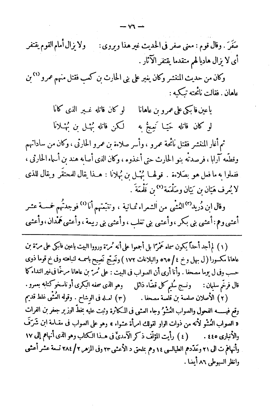 ثم أغار المنتشر فقتل نائحة عمرو، وأسر صلاءة بن عمرو الحارثي، وكان من ساداتهم وقطّعه آراباً، فرصدته بنو الحارث حتى أخذوه، وكان الذي أصابه هند بن أسماء الحارثي، ففعلوا به ما فعل هو بصلاءة. قولها بهل بن بهلانا: هذا يقال للمحتقر ويقال للذي لا يعرف هيّان بن بيّان وصلمعة بن قلمعة.