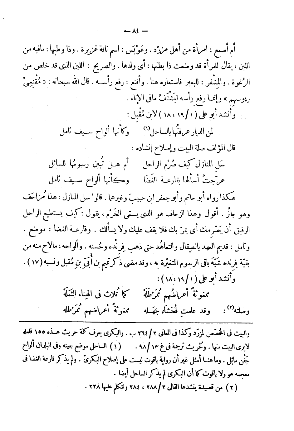 هكذا رواه أبو حاتم وأبو جعفر ابن حبيب وغيرهما. قالوا سل المنازل: هذا مزاحف وهو جائز. أقول وهذا الزحاف هو الذي يسمىّ الخرم، يقول: كيف يستطيع الراحل الرفيق أن يصرمك أي يمرّ بك فلا يقف عليك ولا يسألك. وقارعة الغضا: موضع. وثامل: قديم العهد بالصقال والتعاهد حتى ذهب فرنده وحسنه. وألواحه: ما لاح منه من بقيّة فرنده شبّه باقي الرسوم المتغيّرة به، وقد مضى ذكر تميم بن أبيّ بن مقبل ونسبه.