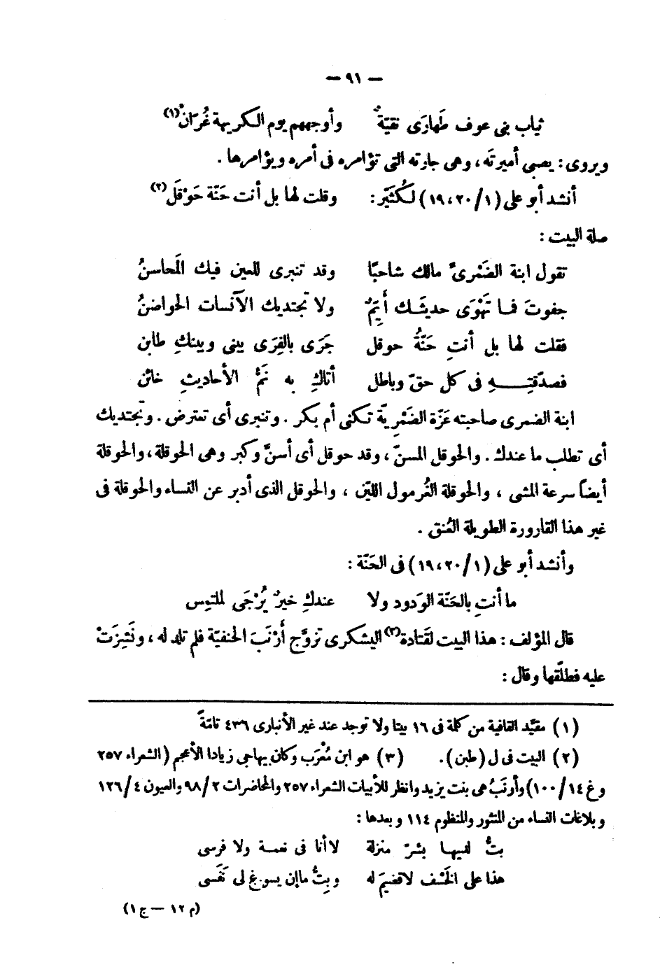 ابنة الضمري صاحبته عزّة الضمريّة تكنى أم بكر. وتنبري أي تعترض. وتجتديك أي تطلب ما عندك. والحوقل المسنّ، وقد حوقل أي أسنّ وكبر وهي الحوقلة، والحوقلة أيضاً سرعة المشي، والحوقلة الغرمول الليّن، والحوقل الذي أدبر عن النساء والحوقلة في غير هذا القارورة الطويلة العنق.