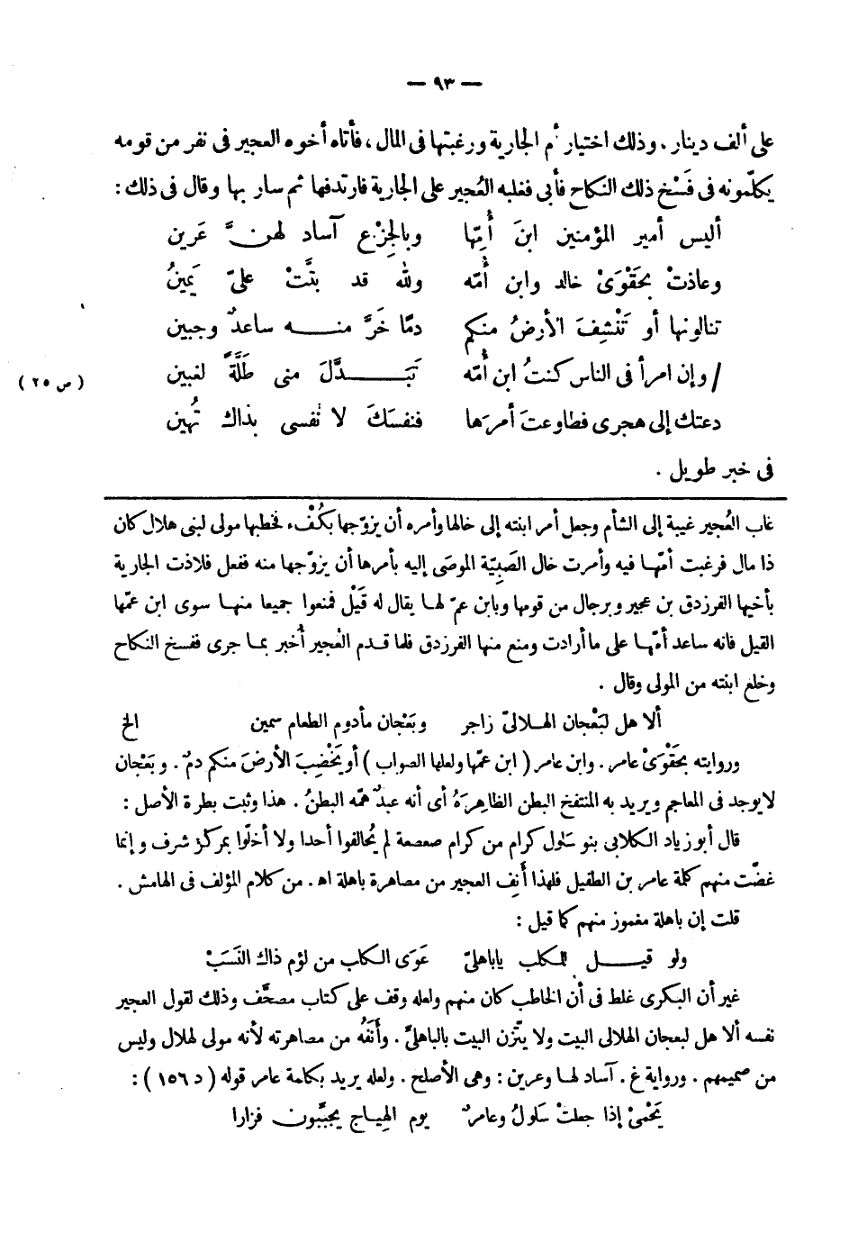 على ألف دينار، وذلك اختيار أمّ الجارية ورغبتها في المال، فأتاه أخوه العجير في نفر من قومه يكلّمونه في فسخ ذلك النكاح فأبى فغلبه العجير على الجارية فارتدفها ثم سار بها وقال في ذلك: