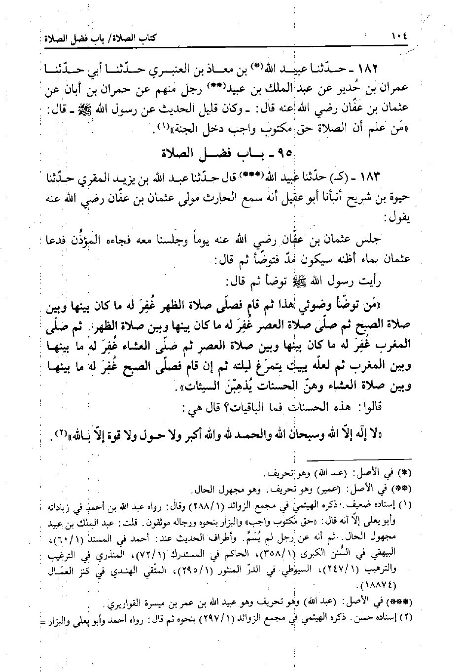 182 - حَدَّثَنَا عُبَيْدُ اللَّهِ بْنُ مُعَاذٍ الْعَنْبَرِيُّ، حَدَّثَنَا أَبِي، حَدَّثَنَا عِمْرَانُ بْنُ حُدَيْرٍ، عَنْ عَبْدِ الْمَلِكِ بْنِ عُبَيْدٍ رَجُلٍ مِنْهُمْ، عَنْ حُمْرَانَ بْنِ أَبَانٍ، عَنْ عُثْمَانَ بْنِ عَفَّانَ رَضِيَ اللَّهُ عَنْهُ قَالَ: - وَكَانَ قَلِيلَ الْحَدِيثِ عَنْ رَسُولِ اللَّهِ صَلَّى اللَّهُ عَلَيْهِ وَسَلَّمَ - قَالَ: «مَنْ عَلِمَ أَنَّ الصَّلاةَ حَقٌّ مَكْتُوبٌ وَاجِبٌ دَخَلَ الْجَنَّةَ» .
