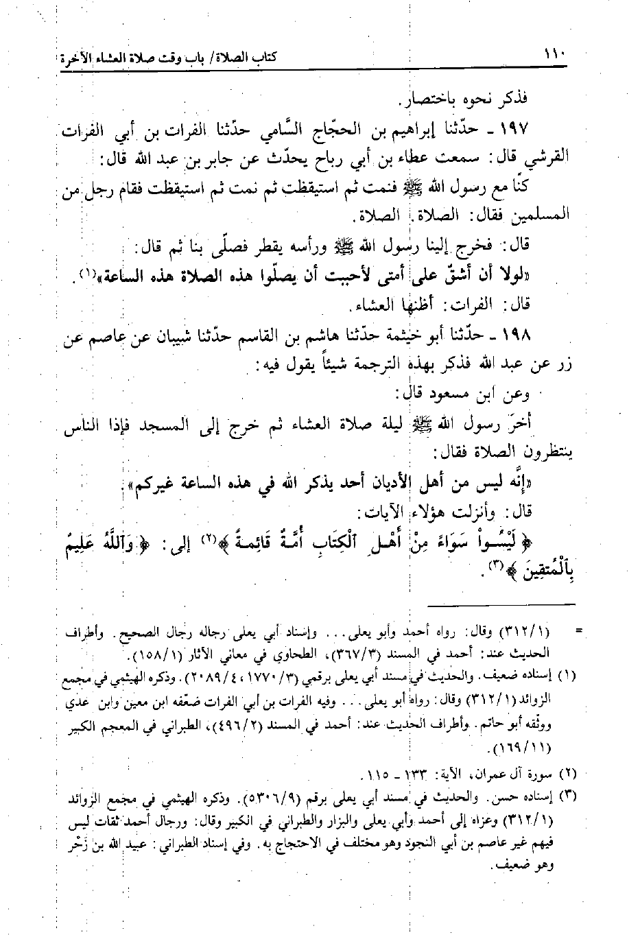 198 - حَدَّثَنَا أَبُو خَيْثَمَةَ، حَدَّثَنَا هَاشِمُ بْنُ الْقَاسِمِ، حَدَّثَنَا شَيْبَانُ، عَنْ عَاصِمٍ، عَنْ زِرٍّ، عَنْ عَبْدِ اللَّهِ، فَذَكَرَ بِهَذِهِ التَّرْجَمَةِ شَيْئًا يَقُولُ فِيهِ: وَعَنِ ابْنِ مَسْعُودٍ قَالَ: أَخَّرَ رَسُولُ اللَّهِ صَلَّى اللَّهُ عَلَيْهِ وَسَلَّمَ لَيْلَةً صَلاةَ الْعِشَاءِ ثُمَّ خَرَجَ إِلَى الْمَسْجِدِ فَإِذَا النَّاسُ يَنْتَظِرُونَ الصَّلاةَ فَقَالَ: «إِنَّهُ لَيْسَ مِنْ أَهْلِ الأَدْيَانِ أَحَدٌ يَذْكُرُ اللَّهَ فِي هَذِهِ السَّاعَةِ غَيْرَكُمْ» .