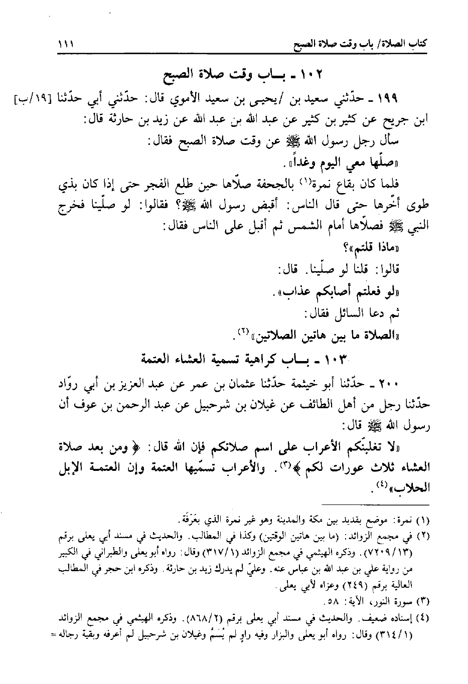 200 - حَدَّثَنَا أَبُو خَيْثَمَةَ، حَدَّثَنَا عُثْمَانُ بْنُ عُمَرَ، عَنْ عَبْدِ الْعَزِيزِ بْنِ أَبِي رَوَّادٍ، حَدَّثَنَا رَجُلٌ مِنْ أَهْلِ الطَّائِفِ، عَنْ غَيْلانَ بْنِ شُرَحْبِيلَ، عَنْ عَبْدِ الرَّحْمَنِ بْنِ عَوْفٍ أَنَّ رَسُولَ اللَّهِ صَلَّى اللَّهُ عَلَيْهِ وَسَلَّمَ قَالَ: " لا تَغْلِبَنَّكُمُ الأَعْرَابُ عَلَى اسْمِ صَلاتِكُمْ فَإِنَّ اللَّهَ قَالَ: {وَمِنْ بَعْدِ صَلاةِ الْعِشَاءِ ثَلاثُ عَوْرَاتٍ لَكُمْ} [النور: 58] .