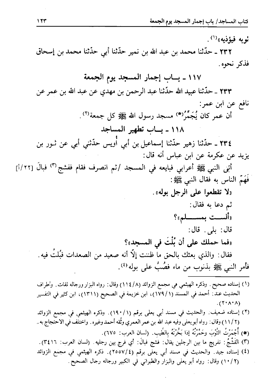 234 - حَدَّثَنَا زُهَيْرٌ، حَدَّثَنَا إِسْمَاعِيلُ بْنُ أَبِي أُوَيْسٍ، حَدَّثَنِي أَبِي، عَنْ ثَوْرِ بْنِ يَزِيدَ، عَنْ عِكْرِمَةَ، عَنِ ابْنِ عَبَّاسٍ أَنَّهُ قَالَ: أَتَى النَّبِيَّ صَلَّى اللَّهُ عَلَيْهِ وَسَلَّمَ أَعْرَابِيٌّ، فَبَايَعَهُ فِي الْمَسْجِدِ ثُمَّ انْصَرَفَ فَقَامَ فَفَشَجَ فَبَالَ، فَهَمَّ النَّاسُ بِهِ فَقَالَ النَّبِيُّ صَلَّى اللَّهُ عَلَيْهِ وَسَلَّمَ: «لا تَقْطَعُوا عَلَى الرَّجُلِ بَوْلَهُ» .
