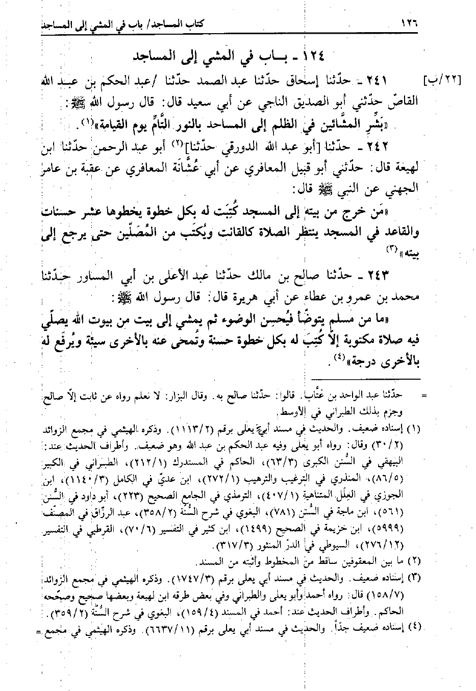 241 - حَدَّثَنَا إِسْحَاقُ، حَدَّثَنَا عَبْدُ الصَّمَدِ، حَدَّثَنَا عَبْدُ الْحَكَمِ بْنُ عَبْدِ اللَّهِ الْقَاصُّ، حَدَّثَنِي أَبُو الصِّدِّيقِ النَّاجِيُّ، عَنْ أَبِي سَعِيدٍ، قَالَ: قَالَ رَسُولُ اللَّهِ صَلَّى اللَّهُ عَلَيْهِ وَسَلَّمَ: «بَشِّرِ الْمَشَّائِينَ فِي الظُّلَمِ إِلَى الْمَسَاجِدِ بِالنُّورِ التَّامِّ يَوْمَ الْقِيَامَةِ» .