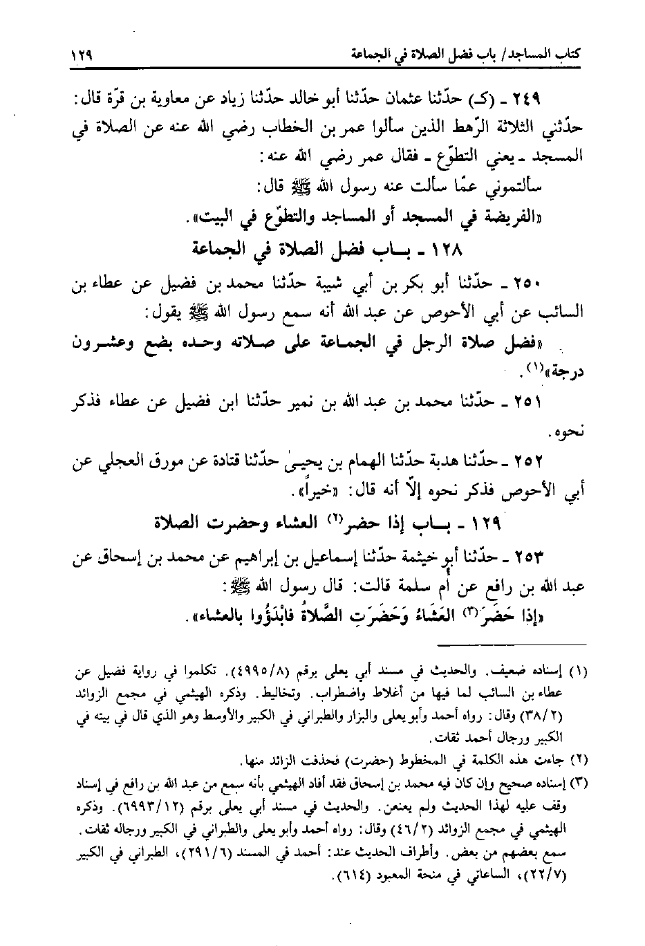 250 - حَدَّثَنَا أَبُو بَكْرِ بْنُ أَبِي شَيْبَةَ، حَدَّثَنَا مُحَمَّدُ بْنُ فُضَيْلٍ، عَنْ عَطَاءِ بْنِ السَّائِبِ، عَنْ أَبِي الأَحْوَصِ، عَنْ عَبْدِ اللَّهِ أَنَّهُ سَمِعَ رَسُولَ اللَّهِ صَلَّى اللَّهُ عَلَيْهِ وَسَلَّمَ يَقُولُ: «فَضْلُ صَلاةِ الرَّجُلِ فِي الْجَمَاعَةِ عَلَى صَلاتِهِ وَحْدَهُ بِضْعٌ وَعِشْرُونَ دَرَجَةً» .