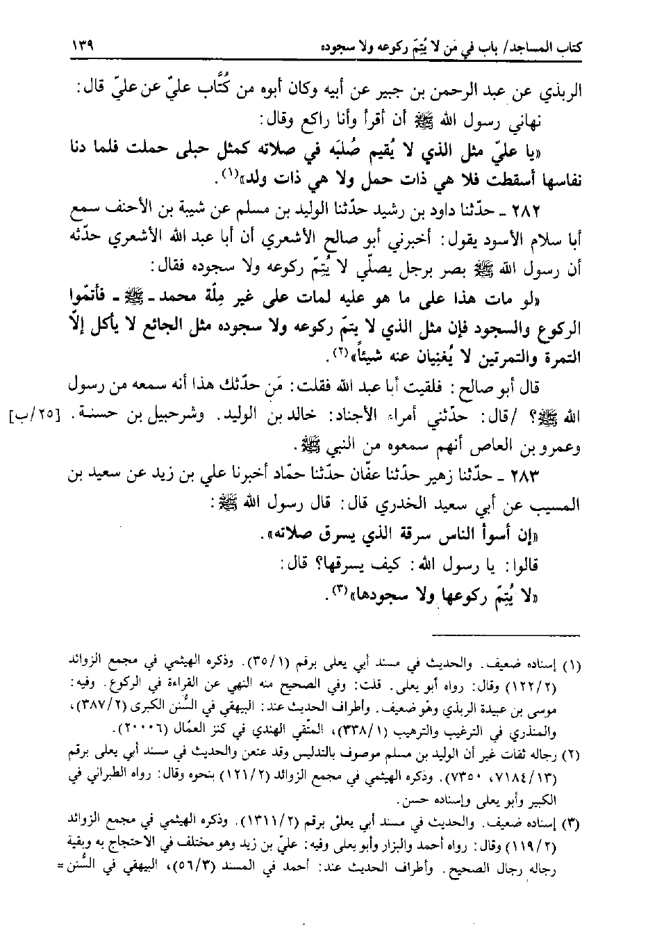 282 - حَدَّثَنَا دَاوُدُ بْنُ رُشَيْدٍ، حَدَّثَنَا الْوَلِيدُ بْنُ مُسْلِمٍ، عَنْ شَيْبَةَ بْنِ الأَحْنَفِ سَمِعَ أَبَا سَلامٍ الأَسْوَدَ، يَقُولُ: أَخْبَرَنِي أَبُو صَالِحٍ الأَشْعَرِيُّ أَنَّ أَبَا عَبْدِ اللَّهِ الأَشْعَرِيَّ حَدَّثَهُ أَنَّ رَسُولَ اللَّهِ صَلَّى اللَّهُ عَلَيْهِ وَسَلَّمَ بَصُرَ بِرَجُلٍ يُصَلِّي لا يُتِمُّ رُكُوعَهُ وَلا سُجُودَهُ، فَقَالَ: «لَوْ مَاتَ هَذَا عَلَى مَا هُوَ عَلَيْهِ، لَمَاتَ عَلَى غَيْرِ مِلَّةِ مُحَمَّدٍ - صَلَّى اللَّهُ عَلَيْهِ وَسَلَّمَ - فَأَتِمُّوا الرُّكُوعَ وَالسُّجُودَ فَإِنَّ مَثَلَ الَّذِي لا يُتِمُّ رُكُوعَهُ وَلا سُجُودَهُ مَثَلُ الْجَائِعِ لا يَأْكُلُ إِلا التَّمْرَةَ وَالتَّمْرَتَيْنِ لا يُغْنِيَانِ عَنْهُ شَيْئًا» .