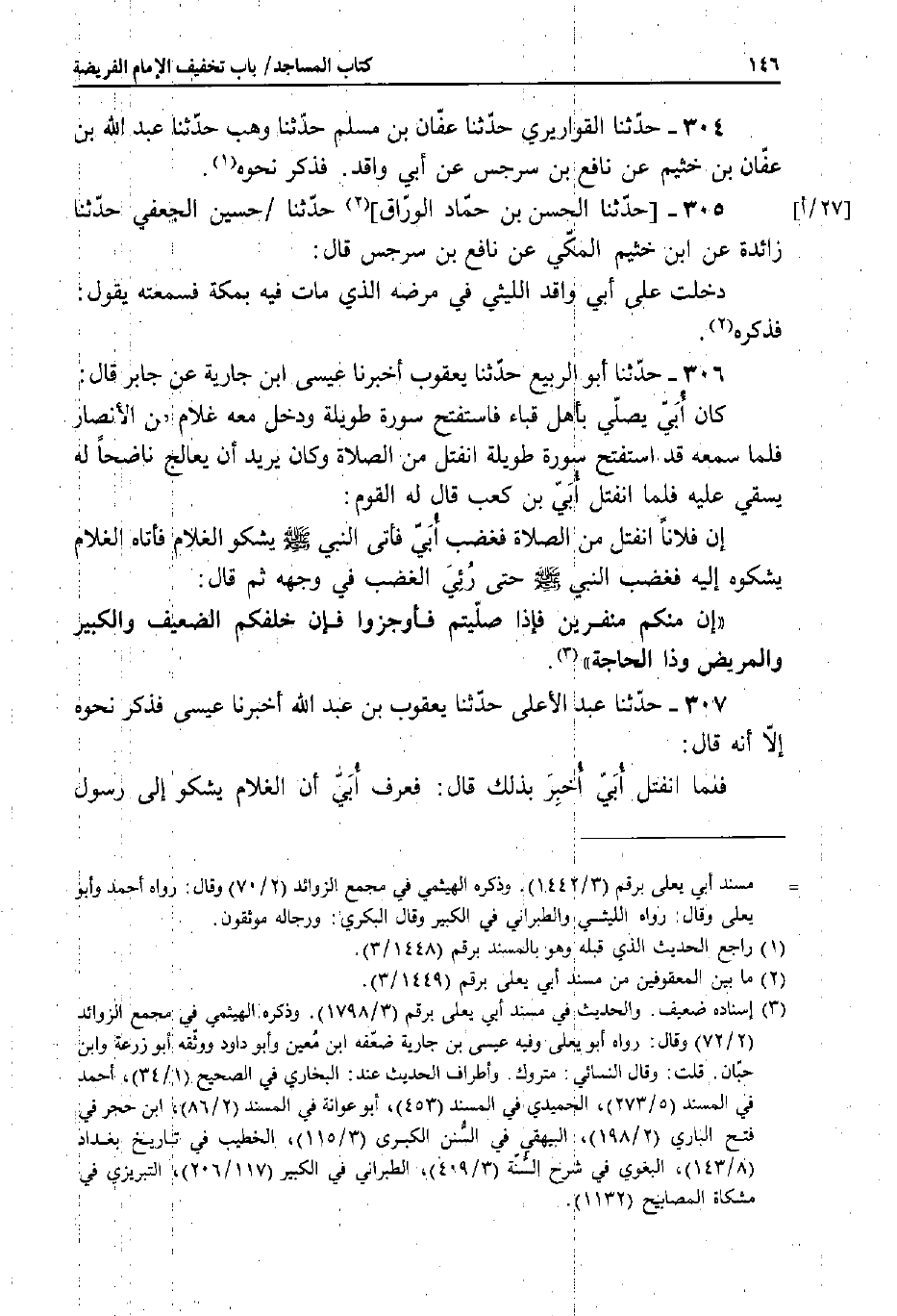 306 - حَدَّثَنَا أَبُو الرَّبِيعِ، حَدَّثَنَا يَعْقُوبُ، أَخْبَرَنَا عِيسَى بْنُ جَارِيَةَ، عَنْ جَابِرٍ قَالَ: كَانَ أُبَيٌّ يُصَلِّي بِأَهْلِ قُبَاءٍ، فَاسْتَفْتَحَ سُورَةً طَوِيلَةً وَدَخَلَ مَعَهُ غُلامٌ مِنَ الأَنْصَارِ، فَلَمَّا سَمِعَهُ قَدِ اسْتَفْتَحَ سُورَةً طَوِيلَةً انْفَتَلَ مِنَ الصَّلاةِ وَكَانَ يُرِيدُ أَنْ يُعَالِجَ نَاضِحًا لَهُ يَسْقِي عَلَيْهِ؛ فَلَمَّا انْفَتَلَ أُبَيُّ بْنُ كَعْبٍ قَالَ لَهُ الْقَوْمُ: إِنَّ فُلانًا انْفَتَلَ مِنَ الصَّلاةِ فَغَضِبَ أُبَيٌّ فَأَتَى النَّبِيَّ صَلَّى اللَّهُ عَلَيْهِ وَسَلَّمَ يَشْكُو الْغُلامَ فَأَتَاهُ الْغُلامُ يَشْكُوهُ إِلَيْهِ، فَغَضِبَ النَّبِيُّ صَلَّى اللَّهُ عَلَيْهِ وَسَلَّمَ حَتَّى رُئِيَ الْغَضَبُ فِي وَجْهِهِ ثُمَّ قَالَ: «إِنَّ مِنْكُمْ مُنَفِّرِينَ فَإِذَا صَلَّيْتُمْ فَأَوْجِزُوا فَإِنَّ خَلْفَكُمُ الضَّعِيفَ وَالْكَبِيرَ وَالْمَرِيضَ وَذَا الْحَاجَةِ» .