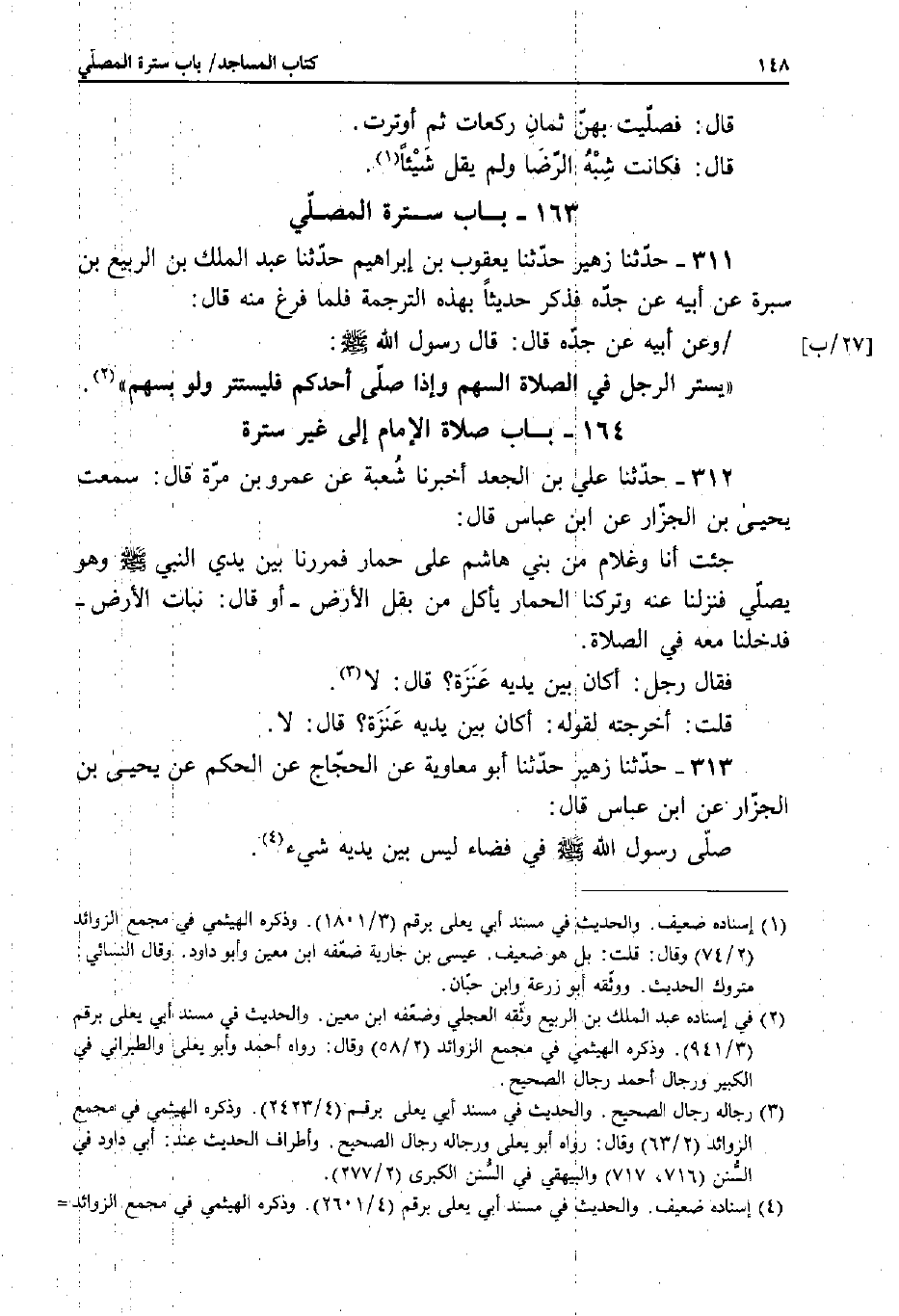 312 - حَدَّثَنَا عَلِيُّ بْنُ الْجَعْدِ، أَخْبَرَنَا شُعْبَةُ، عَنْ عَمْرِو بْنِ مُرَّةَ قَالَ: سَمِعْتُ يَحْيَى بْنَ الْجَزَّارِ، عَنِ ابْنِ عَبَّاسٍ قَالَ: جِئْتُ أَنَا وَغُلامٌ مِنْ بَنِي هَاشِمٍ عَلَى حِمَارٍ فَمَرَرْنَا بَيْنَ يَدَيِ النَّبِيِّ صَلَّى اللَّهُ عَلَيْهِ وَسَلَّمَ وَهُوَ يُصَلِّي، فَنَزَلْنَا عَنْهُ وَتَرَكْنَا الْحِمَارَ يَأْكُلُ مِنْ بَقْلِ الأَرْضِ - أَوْ قَالَ: نَبَاتِ الأَرْضِ - فَدَخَلْنَا مَعَهُ فِي الصَّلاةِ.