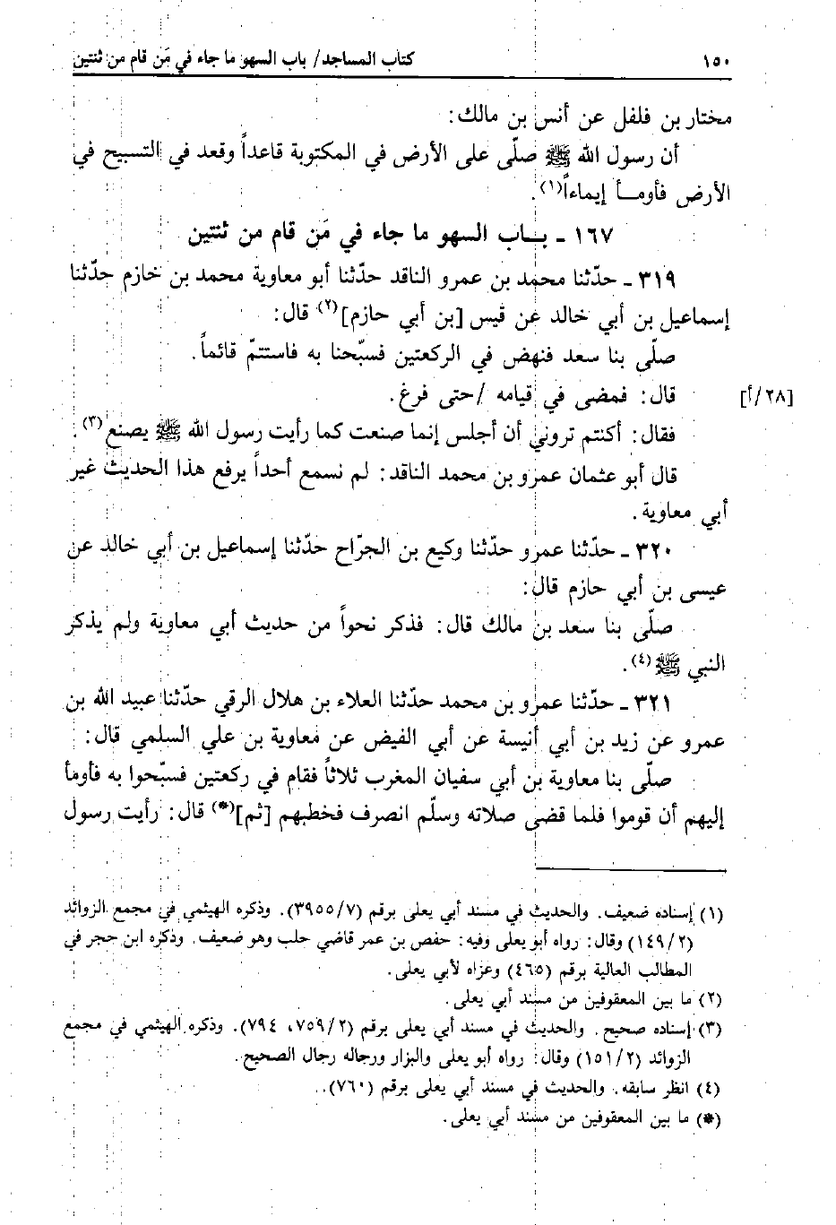 319 - حَدَّثَنَا مُحَمَّدُ بْنُ عَمْرٍو النَّاقِدُ، حَدَّثَنَا أَبُو مُعَاوِيَةَ مُحَمَّدُ بْنُ خَازِمٍ، حَدَّثَنَا إِسْمَاعِيلُ بْنُ أَبِي خَالِدٍ، عَنْ قَيْسِ بْنِ أَبِي حَازِمٍ، قَالَ: صَلَّى بِنَا سَعْدٌ فَنَهَضَ فِي الرَّكْعَتَيْنِ فَسَبَّحْنَا بِهِ فَاسْتَتَمَّ قَائِمًا.