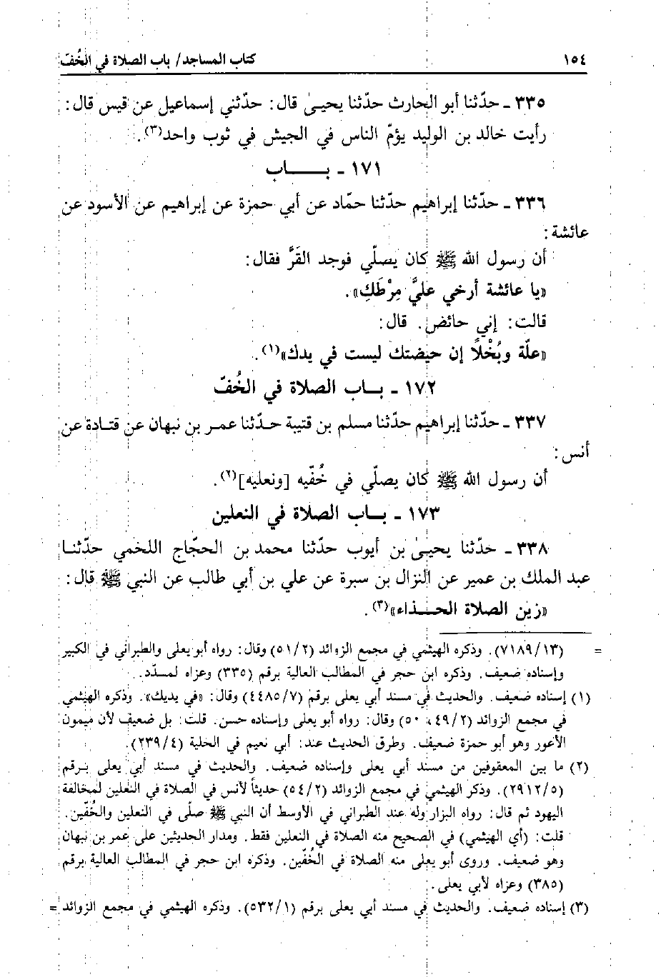 338 - حَدَّثَنَا يَحْيَى بْنُ أَيُّوبَ، حَدَّثَنَا مُحَمَّدُ بْنُ الْحَجَّاجِ اللَّخْمِيُّ، حَدَّثَنَا عَبْدُ الْمَلِكِ بْنُ عُمَيْرٍ، عَنِ النَّزَّالِ بْنِ سَبْرَةَ، عَنْ عَلِيِّ بْنِ أَبِي طَالِبٍ، عَنِ النَّبِيِّ صَلَّى اللَّهُ عَلَيْهِ وَسَلَّمَ قَالَ: «زَيْنُ الصَّلاةِ الْحِذَاءُ» .