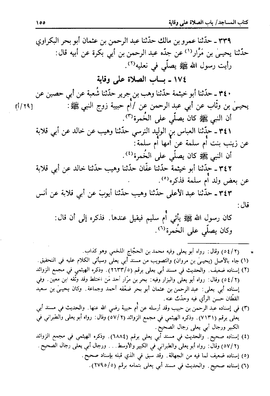 340 - حَدَّثَنَا أَبُو خَيْثَمَةَ، حَدَّثَنَا وَهْبُ بْنُ جَرِيرٍ، حَدَّثَنَا شُعْبَةُ، عَن أَبِي حُصَيْنٍ، عَنْ يَحْيَى بْنِ وَثَّابٍ، عَنْ أَبِي عَبْدِ الرَّحْمَنِ، عَنْ أُمِّ حَبِيبَةَ زَوْجِ النَّبِيِّ صَلَّى اللَّهُ عَلَيْهِ وَسَلَّمَ: أَنَّ النَّبِيَّ صَلَّى اللَّهُ عَلَيْهِ وَسَلَّمَ كَانَ يُصَلِّي عَلَى الْخُمْرَةِ.