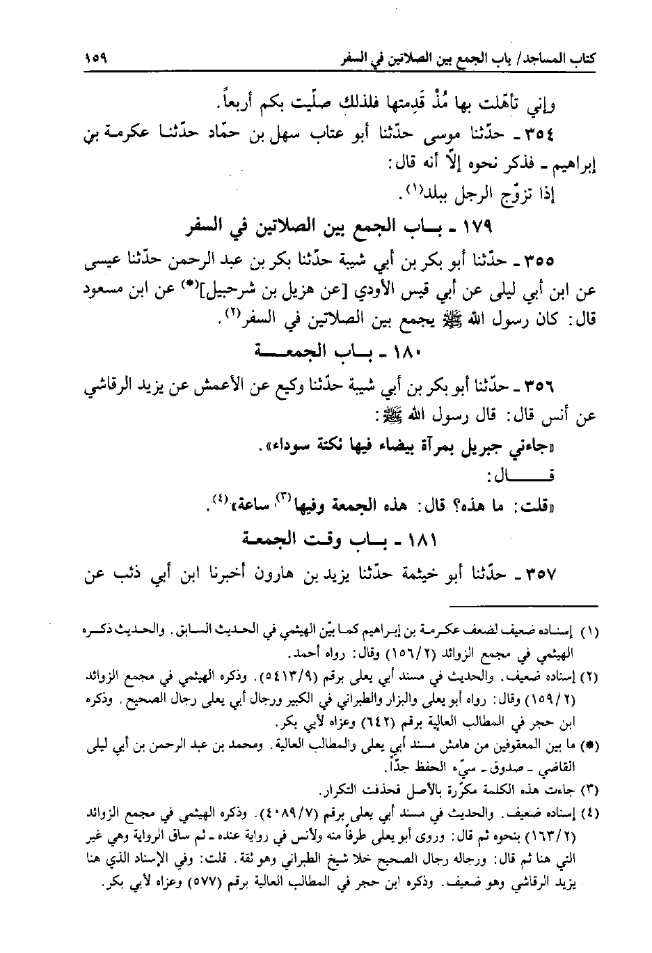 355 - حَدَّثَنَا أَبُو بَكْرِ بْنُ أَبِي شَيْبَةَ، حَدَّثَنَا بَكْرُ بْنُ عَبْدِ الرَّحْمَنِ، حَدَّثَنَا عِيسَى، عَنِ ابْنِ أَبِي لَيْلَى، عَنْ أَبِي قَيْسٍ الأَوْدِيِّ، عَنْ هُزَيْلِ بْنِ شُرَحْبِيلَ، عَنِ ابْنِ مَسْعُودٍ قَالَ: كَانَ رَسُولُ اللَّهِ صَلَّى اللَّهُ عَلَيْهِ وَسَلَّمَ يَجْمَعُ بَيْنَ الصَّلاتَيْنِ فِي السَّفَرِ.