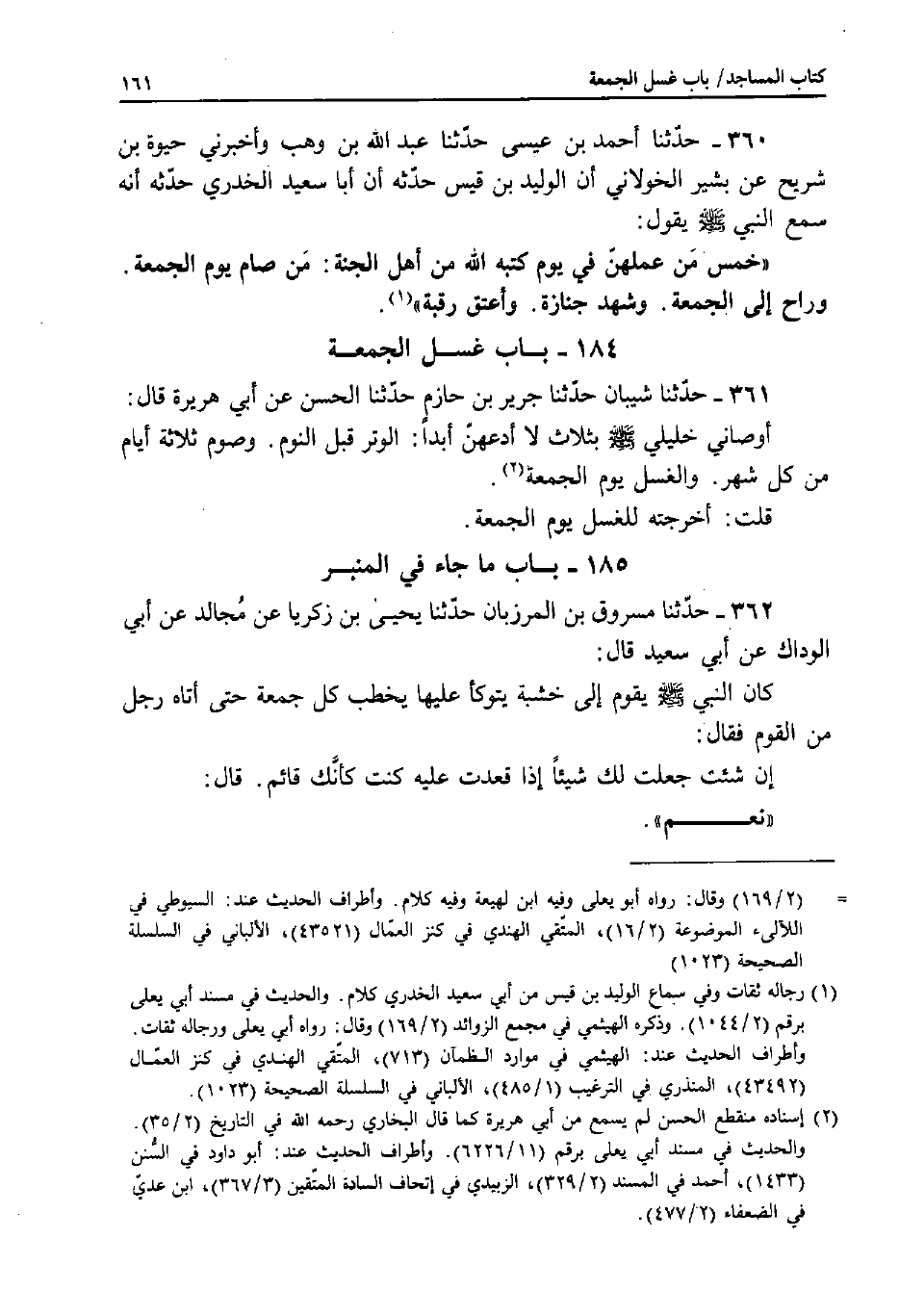 360 - حَدَّثَنَا أَحْمَدُ بْنُ عِيسَى، حَدَّثَنَا عَبْدُ اللَّهِ بْنُ وَهْبٍ، وَأَخْبَرَنِي حَيْوَةُ بْنُ شُرَيْحٍ، عَنْ بَشِيرٍ الْخَوْلانِيِّ: أَنَّ الْوَلِيدَ بْنَ قَيْسٍ حَدَّثَهُ، أَنَّ أَبَا سَعِيدٍ الْخُدْرِيَّ حَدَّثَهُ أَنَّهُ سَمِعَ النَّبِيَّ صَلَّى اللَّهُ عَلَيْهِ وَسَلَّمَ يَقُولُ: " خَمْسٌ مَنْ عَمِلَهُنَّ فِي يَوْمٍ كَتَبَهُ اللَّهُ مِنْ أَهْلِ الْجَنَّةِ: مَنْ صَامَ يَوْمَ الْجُمُعَةِ.