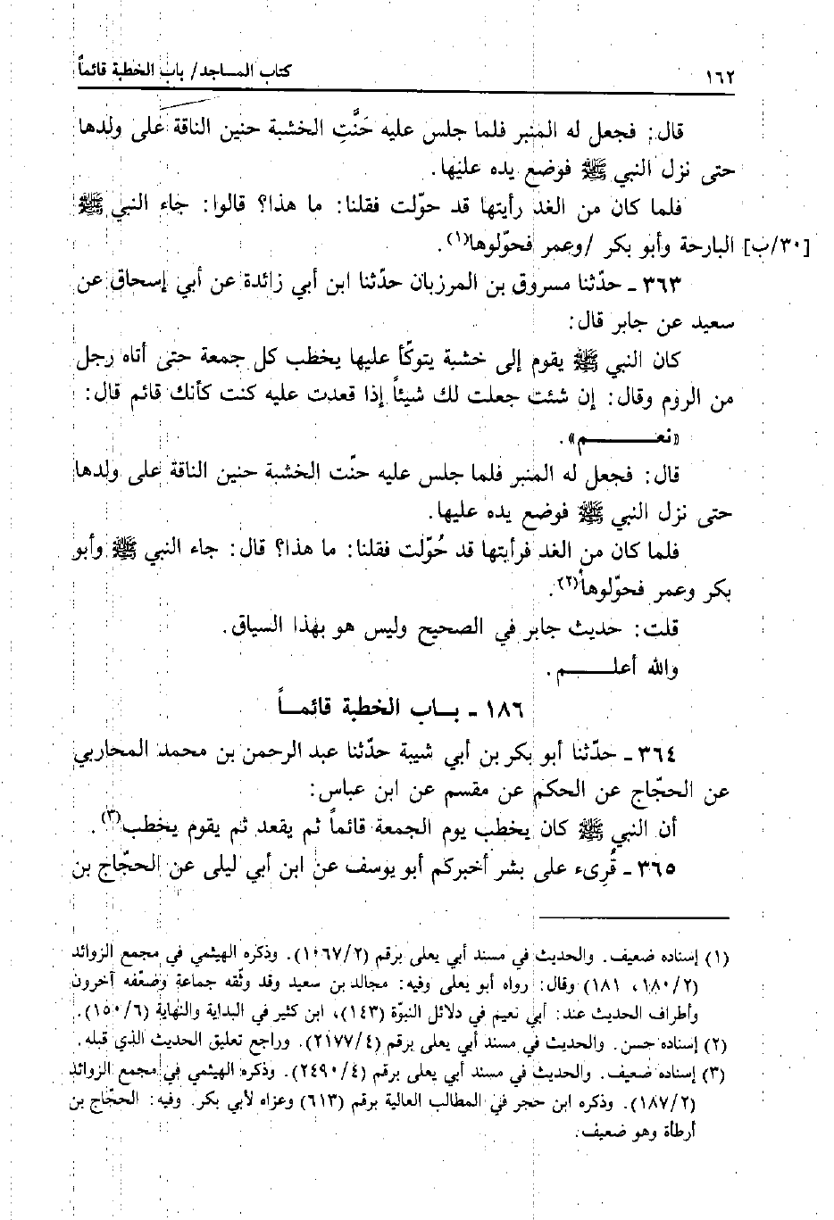 364 - حَدَّثَنَا أَبُو بَكْرِ بْنُ أَبِي شَيْبَةَ، حَدَّثَنَا عَبْدُ الرَّحْمَنِ بْنُ مُحَمَّدٍ الْمُحَارِبِيُّ، عَنِ الْحَجَّاجِ، عَنِ الْحَكَمِ، عَنْ مِقْسَمٍ، عَنِ ابْنِ عَبَّاسٍ: أَنَّ النَّبِيَّ صَلَّى اللَّهُ عَلَيْهِ وَسَلَّمَ كَانَ يَخْطُبُ يَوْمَ الْجُمُعَةِ قَائِمًا ثُمَّ يَقْعُدُ ثُمَّ يَقُومُ يَخْطُبُ. 365 - قُرِئَ عَلَى بِشْرٍ، أَخْبَرَكُمْ أَبُو يُوسُفَ، عَنِ ابْنِ أَبِي لَيْلَى، عَنِ الْحَجَّاجِ بْنِ