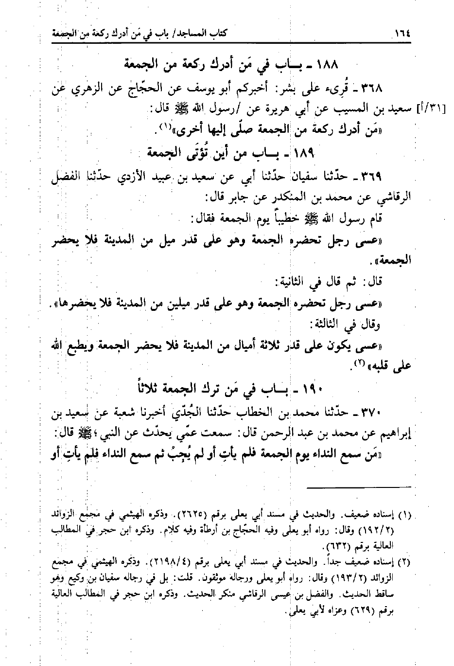 370 - حَدَّثَنَا مُحَمَّدُ بْنُ الْخَطَّابِ، حَدَّثَنَا الْجُدِّيُّ، أَخْبَرَنَا شُعْبَةُ، عَنْ سَعِيدِ بْنِ إِبْرَاهِيمَ، عَنْ مُحَمَّدِ بْنِ عَبْدِ الرَّحْمَنِ قَالَ: سَمِعْتُ عَمِّي يُحَدِّثُ عَنِ النَّبِيِّ صَلَّى اللَّهُ عَلَيْهِ وَسَلَّمَ قَالَ: «مَنْ سَمِعَ النِّدَاءَ يَوْمَ الْجُمُعَةِ فَلَمْ يَأْتِ أَوْ لَمْ يُجِبْ؛ ثُمَّ سَمِعَ النِّدَاءَ فَلَمْ يَأْتِ، أَوْ لَمْ يُجِبْ ثُمَّ سَمِعَ النِّدَاءَ فَلَمْ يَأْتِ أَوْ