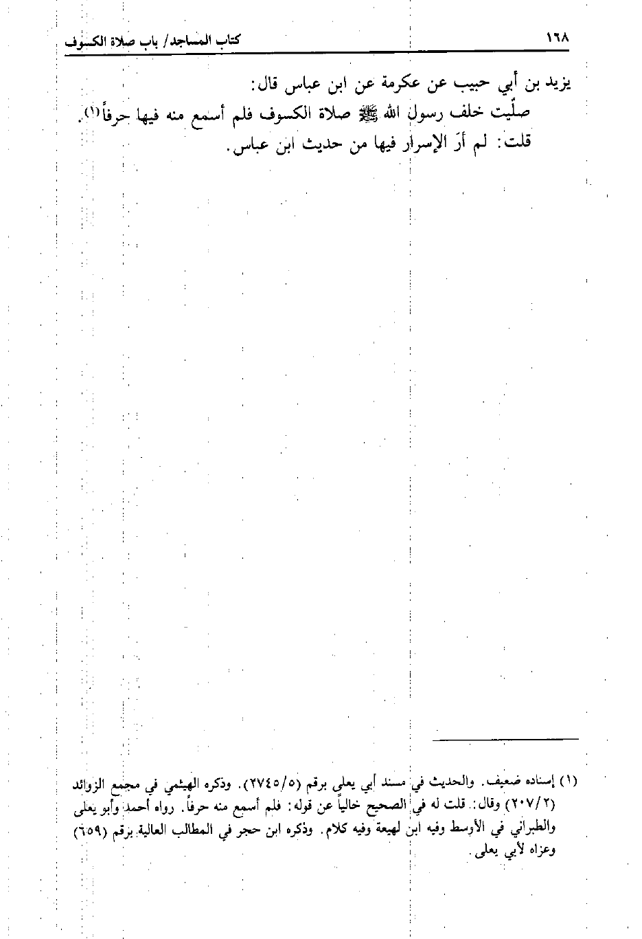 يَزِيدُ بْنُ أَبِي حَبِيبٍ، عَنْ عِكْرِمَةَ، عَنِ ابْنِ عَبَّاسٍ قَالَ: صَلَّيْتُ خَلْفَ رَسُولِ اللَّهِ صَلَّى اللَّهُ عَلَيْهِ وَسَلَّمَ صَلاةَ الْكُسُوفِ فَلَمْ أَسْمَعْ مِنْهُ فِيهَا حَرْفًا.