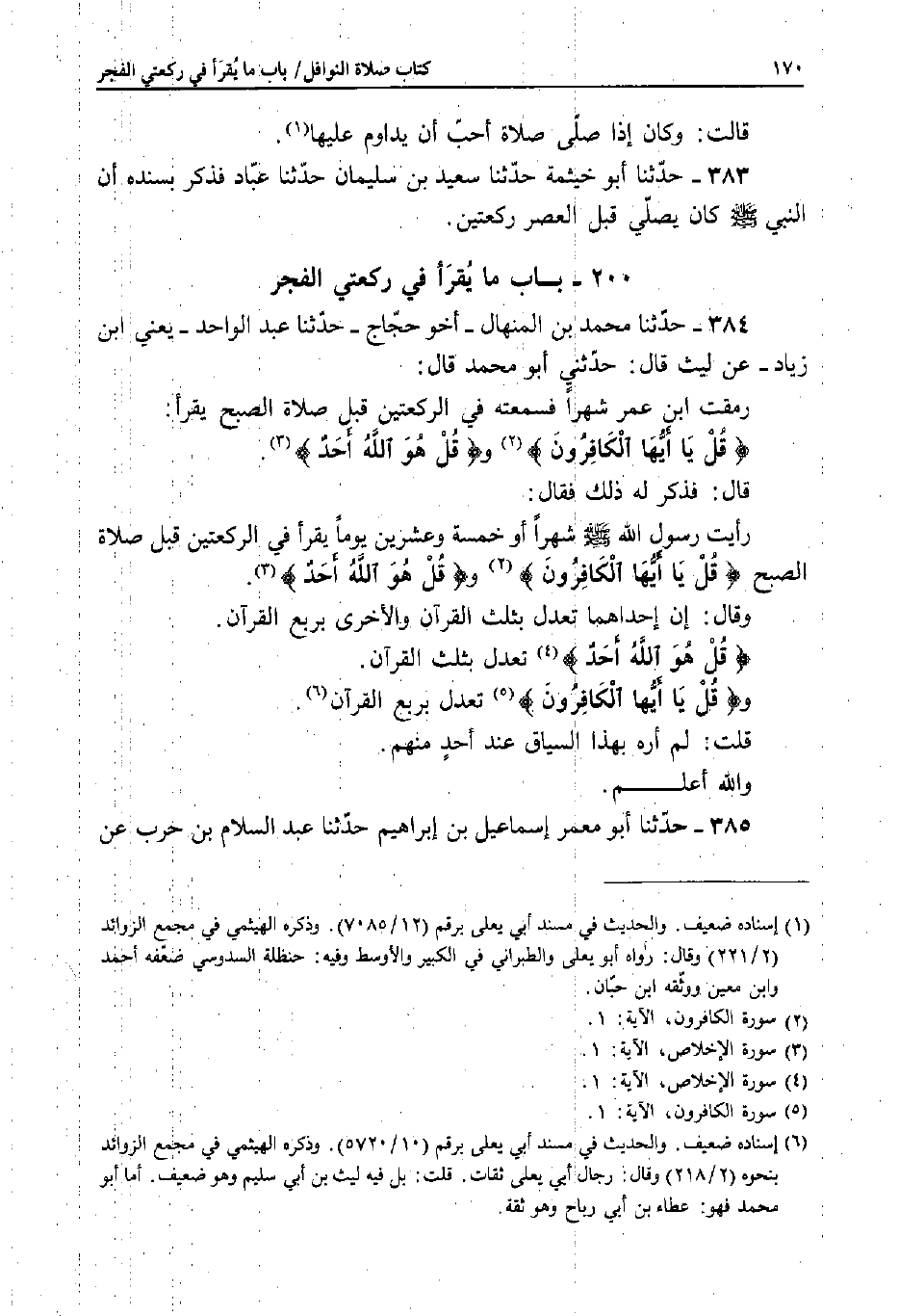 384 - حَدَّثَنَا مُحَمَّدُ بْنُ الْمِنْهَالِ - أَخُو حَجَّاجٍ ـ حَدَّثَنَا عَبْدُ الْوَاحِدِ - يَعْنِي: ابْنَ زِيَادٍ، عَنْ لَيْثٍ قَالَ: حَدَّثَنِي أَبُو مُحَمَّدٍ قَالَ: رَمَقْتُ ابْنَ عُمَرَ شَهْرًا فَسَمِعْتُهُ فِي الرَّكْعَتَيْنِ قَبْلَ صَلاةِ الصُّبْحِ يَقْرَأُ: قُلْ يَأَيُّهَا الْكَافِرُونَ وقُلْ هُوَ اللَّهُ أَحَدٌ.