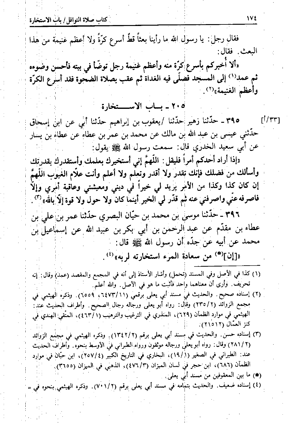 395 - حَدَّثَنَا زُهَيْرٌ، حَدَّثَنَا يَعْقُوبُ بْنُ إِبْرَاهِيمَ، حَدَّثَنَا أَبِي، عَنِ ابْنِ إِسْحَاقَ، حَدَّثَنِي عِيسَى بْنُ عَبْدِ اللَّهِ بْنِ مَالِكٍ، عَنْ مُحَمَّدِ بْنِ عُمَرَ بْنِ عَطَاءٍ، عَنْ عَطَاءِ بْنِ يَسَارٍ، عَنْ أَبِي سَعِيدٍ الْخُدْرِيِّ قَالَ: سَمِعْتُ رَسُولَ اللَّهِ صَلَّى اللَّهُ عَلَيْهِ وَسَلَّمَ يَقُولُ: " إِذَا أَرَادَ أَحَدُكُمْ أَمْرًا فَلْيَقُلِ: «اللَّهُمَّ إِنِّي أَسْتَخِيرُكَ بِعِلْمِكَ وَأَسْتَقْدِرُكَ بِقُدْرَتِكَ، وَأَسْأَلُكَ مِنْ فَضْلِكَ فَإِنَّكَ تَقْدِرُ وَلا أَقْدِرُ وَتَعْلَمُ وَلا أَعْلَمُ وَأَنْتَ عَلامُ الْغُيُوبِ، اللَّهُمَّ إِنْ كَانَ كَذَا وَكَذَا مِنَ الأَمْرِ يُرِيدُ لِي خَيْرًا فِي دِينِي وَمَعِيشَتِي وَعَاقِبَةِ أَمْرِي وَإِلا فَاصْرِفْهُ عَنِّي وَاصْرِفْنِي عَنْهُ ثُمَّ قَدِّرْ لِي الْخَيْرَ أَيْنَمَا كَانَ وَلا حَوْلَ وَلا قُوَّةَ إِلا بِاللَّهِ» .