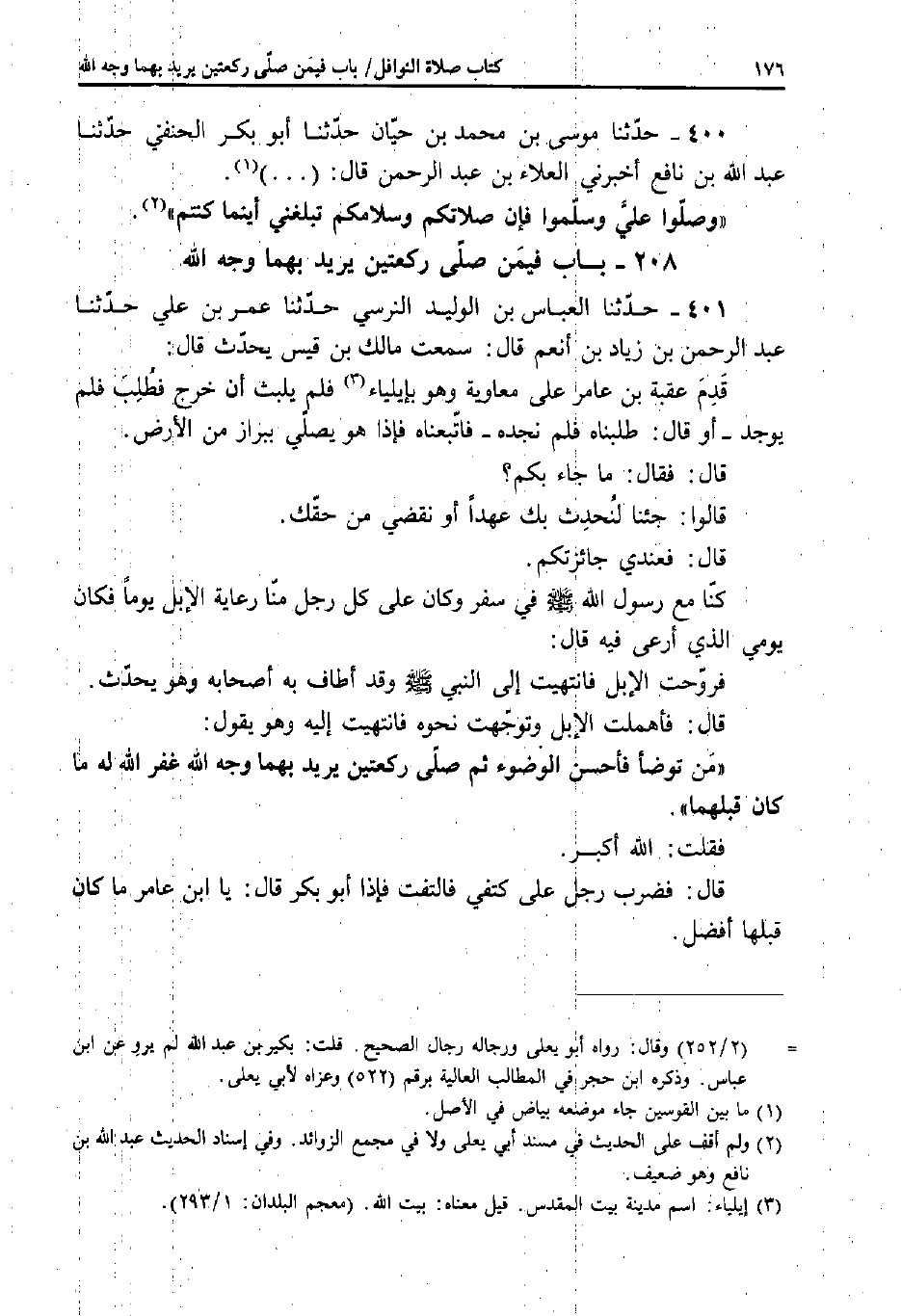 قَالَ: فَأَهْمَلْتُ الإِبِلَ وَتَوَجَّهْتُ نَحْوَهُ فَانْتَهَيْتُ إِلَيْهِ وَهُوَ يَقُولُ: «مَنْ تَوَضَّأَ فَأَحْسَنَ الْوُضُوءَ، ثُمَّ صَلَّى رَكْعَتَيْنِ يُرِيدُ بِهِمَا وَجْهَ اللَّهِ غَفَرَ اللَّهُ لَهُ مَا كَانَ قَبْلَهُمَا» .