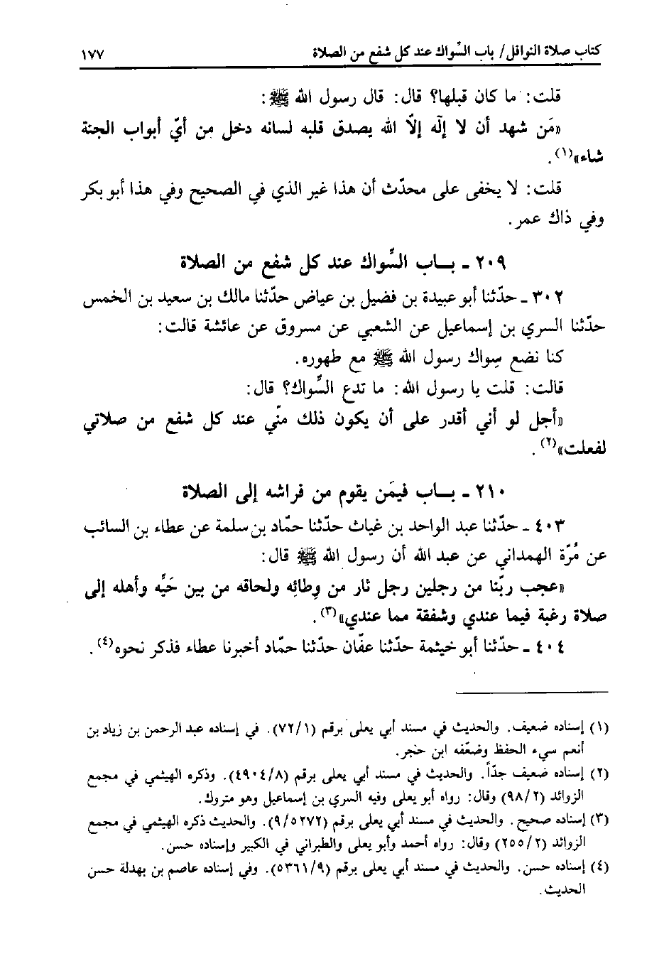 302 - حَدَّثَنَا أَبُو عُبَيْدَةَ بْنُ فُضَيْلِ بْنِ عِيَاضٍ، حَدَّثَنَا مَالِكُ بْنُ سَعِيدِ بْنِ الْخِمْسِ، حَدَّثَنَا السَّرِيُّ بْنُ إِسْمَاعِيلَ، عَنِ الشَّعْبِيِّ، عَنْ مَسْرُوقٍ، عَنْ عَائِشَةَ قَالَتْ: كُنَّا نَضَعُ سِوَاكَ رَسُولِ اللَّهِ صَلَّى اللَّهُ عَلَيْهِ وَسَلَّمَ مَعَ طُهُورِهِ.