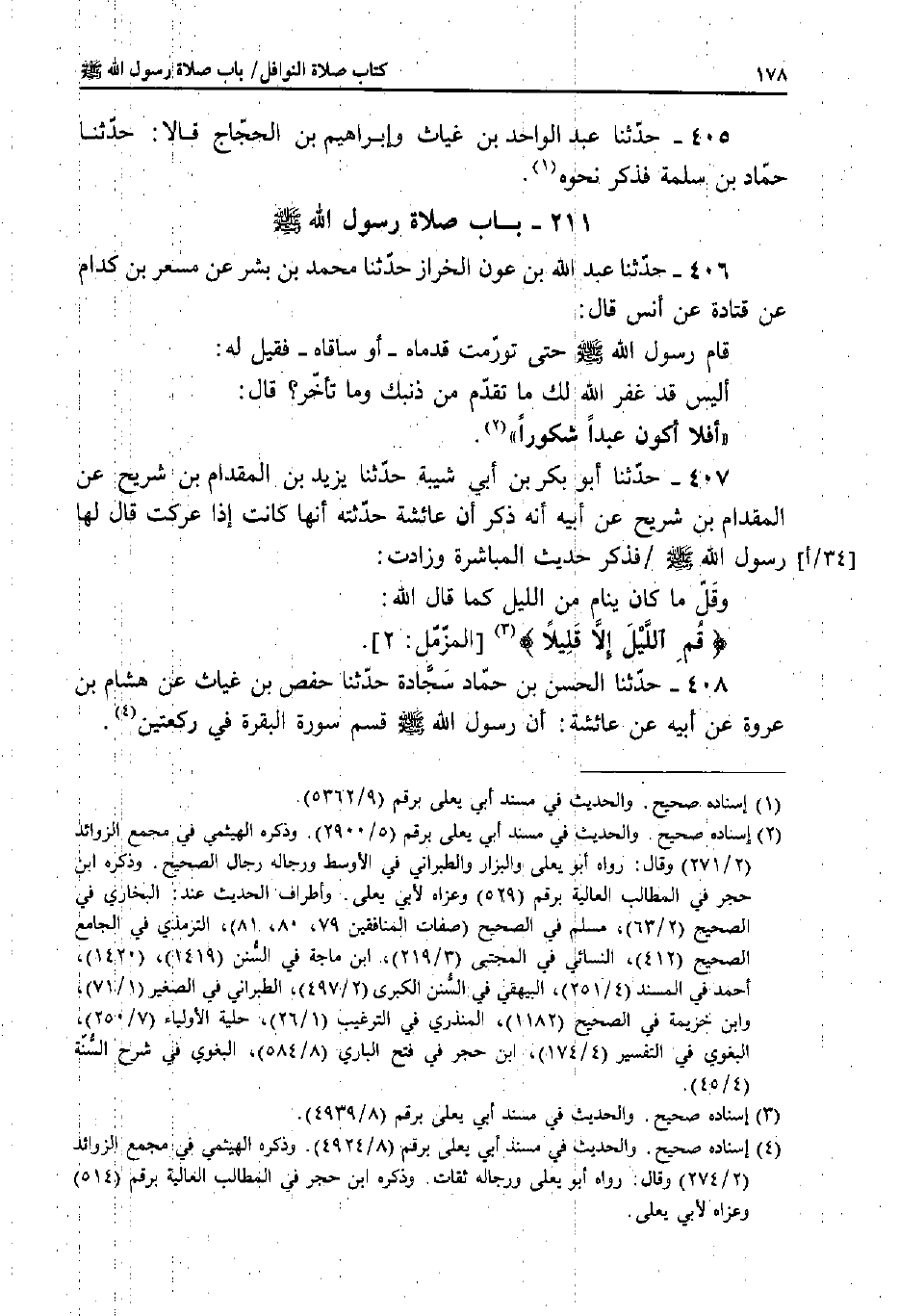 406 - حَدَّثَنَا عَبْدُ الّلَهِ بْنُ عَوْنٍ الْخَرَّازُ، حَدَّثَنَا مُحَمَّدُ بْنُ بِشْرٍ، عَنْ مِسْعَرِ بْنِ كِدَامٍ، عَنْ قَتَادَةَ، عَنْ أَنَسٍ قَالَ: قَامَ رَسُولُ اللَّهِ صَلَّى اللَّهُ عَلَيْهِ وَسَلَّمَ حَتَّى تَوَرَّمَتْ قَدَمَاهُ - أَوْ سَاقَاهُ - فَقِيلَ لَهُ: أَلَيْسَ قَدْ غَفَرَ اللَّهُ لَكَ مَا تَقَدَّمَ مِنْ ذَنْبِكَ وَمَا تَأَخَّرَ؟ قَالَ: «أَفَلا أَكُونُ عَبْدًا شَكُورًا» .